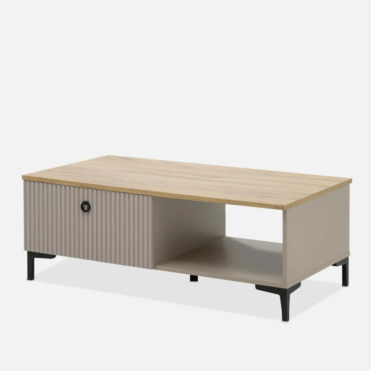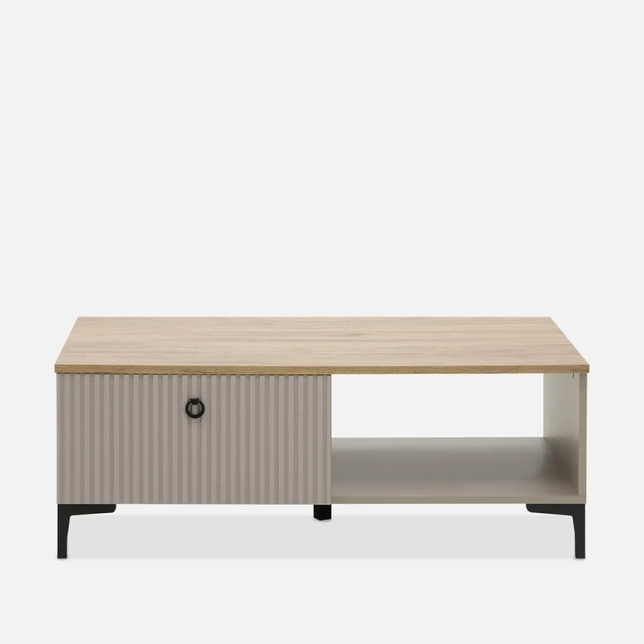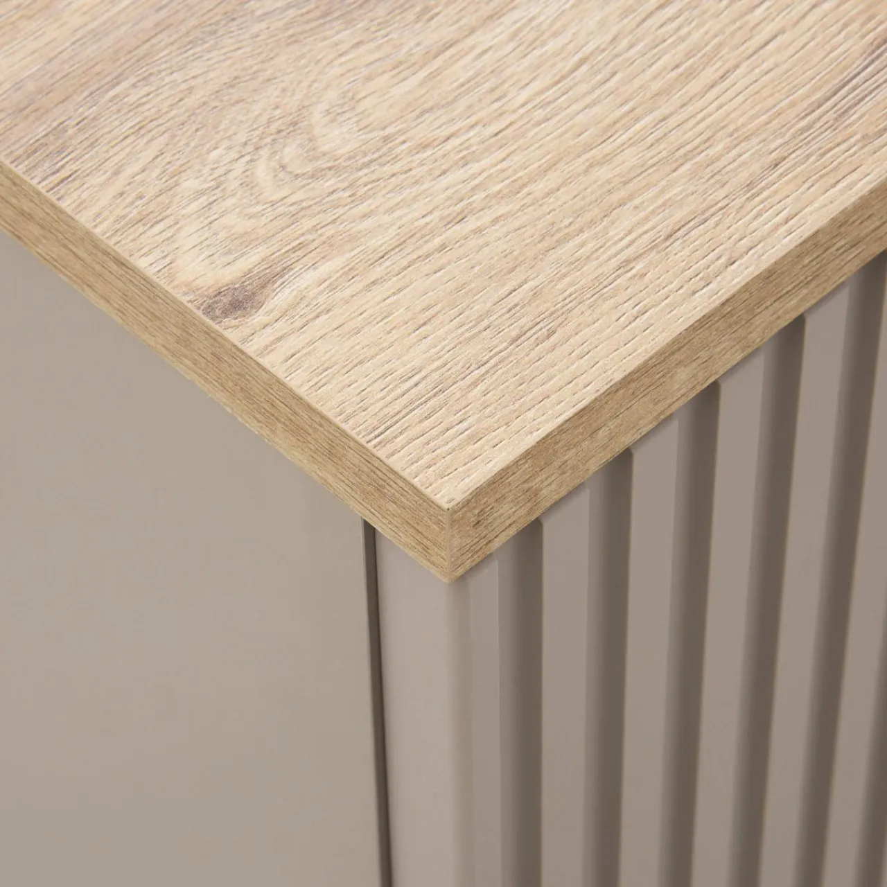 - Ryflowane fronty w kolorze taupe idealnie zgrywają się z korpusami. Wykończone są laminatem i folią.