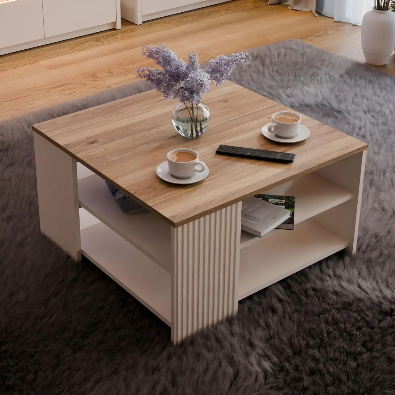 Stolik kawowy OAK SQUERE postawiony przy dużym wypoczynku będzie Twoim towarzyszem przy relaksie z książką lub seansie filmowym. Dwie półki pod blatem pozwolą Ci zapanować nad bałaganem w salonie i mieć potrzebne rzeczy pod ręką, kiedy spędzasz czas na sofie.