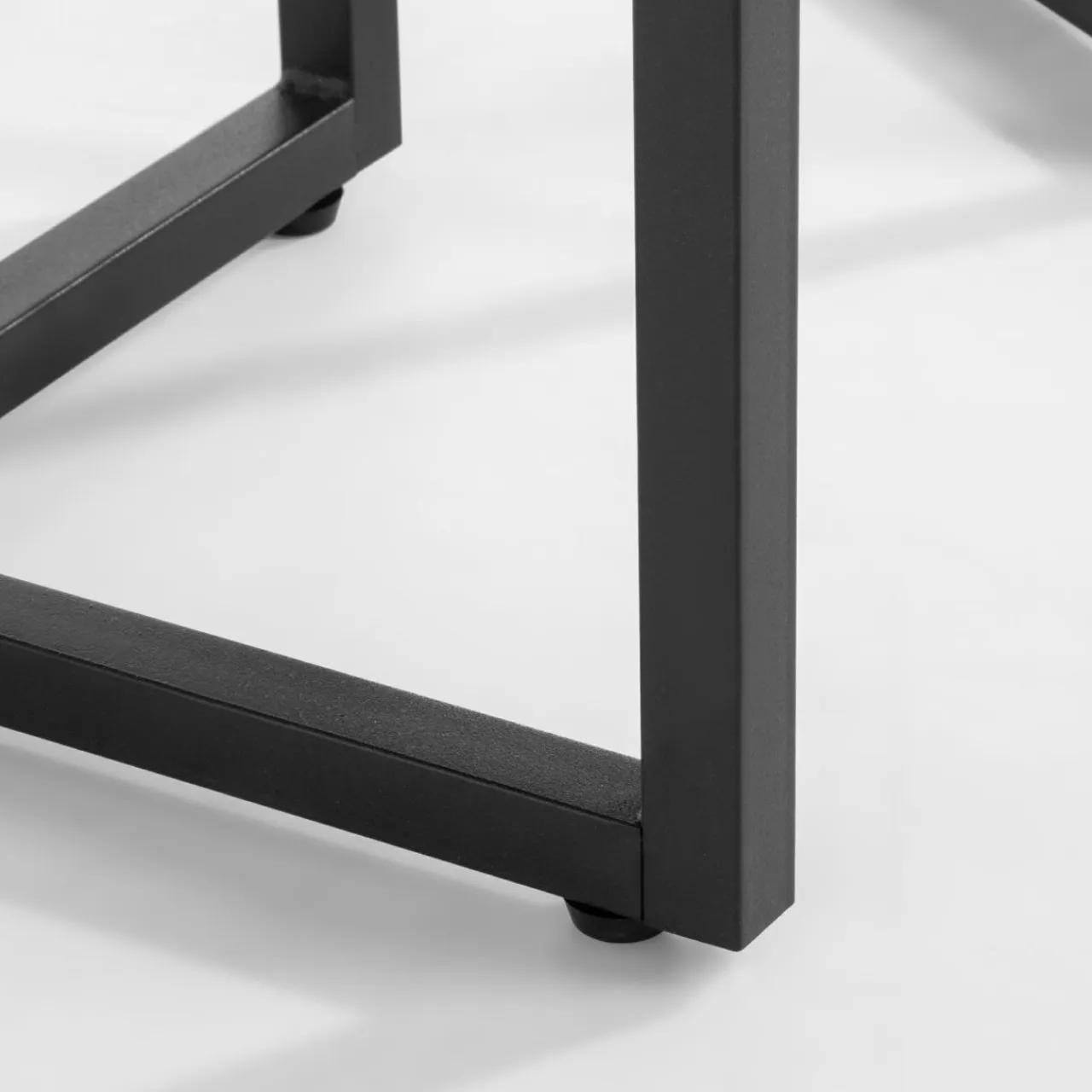 Komplet 2 stolików HERITE cechuje blat w ciemnym odcieniu imitacji drewna i metalowa krzyżowa podstawa. Taki design wyciszy wnętrze i uspokoi kolorystykę industrialnych oraz nowoczesnych wnętrz.