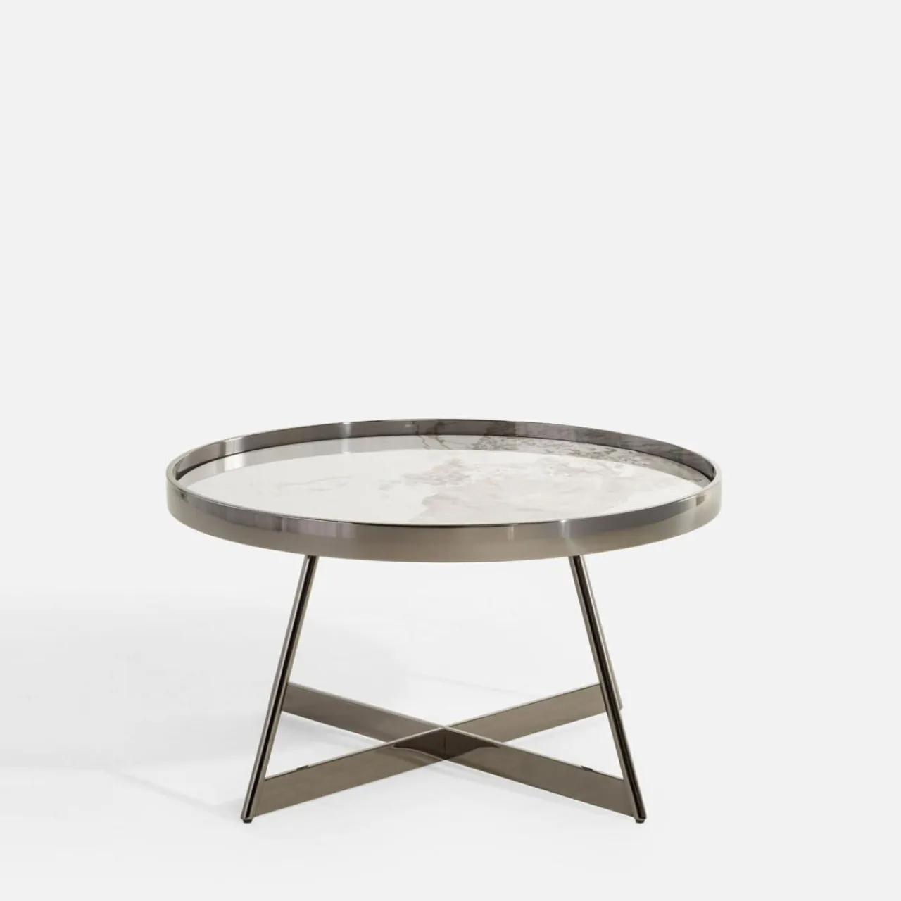 Biały ceramiczny blat i ciemna stal polerowana tworzy harmonijne kolorystycznie połączenie dla aranżacji salonu. Wysoki połysk daje efekt nowojorskiego apartamentu.
