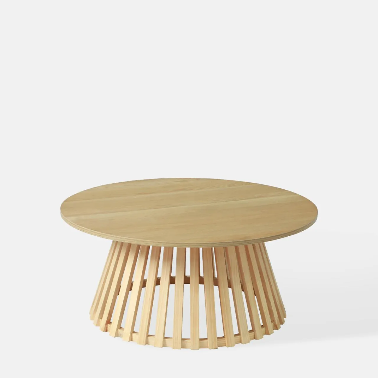 Stolik kawowy FIUSYN wyróżnia się ażurową podstawą w postaci szczebli, która nadaje mu lekkości i naturalnego charakteru. Jasne sosnowe drewno i okrągłe kształty wpiszą się w style minimalistyczne, skandynawskie, japandi oraz boho.
