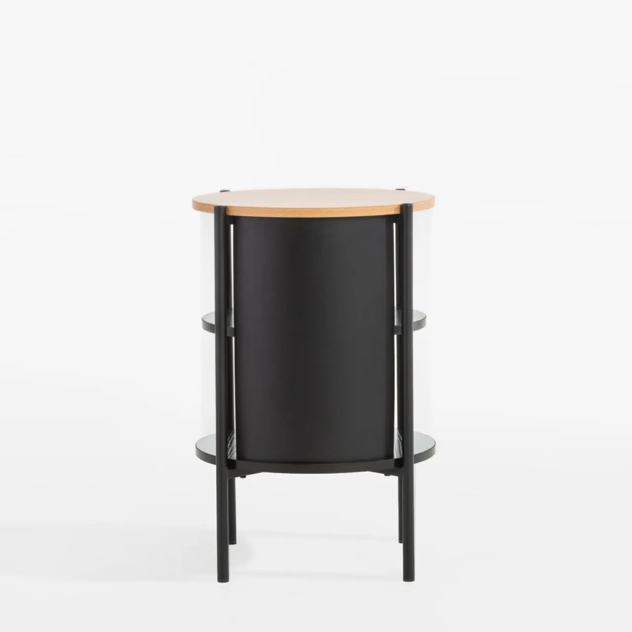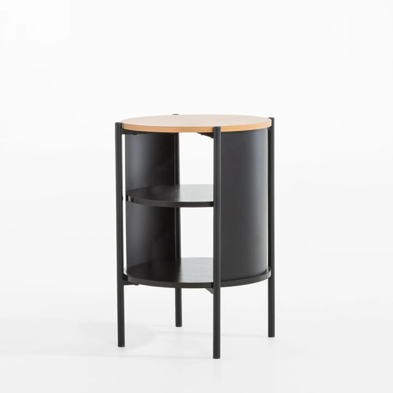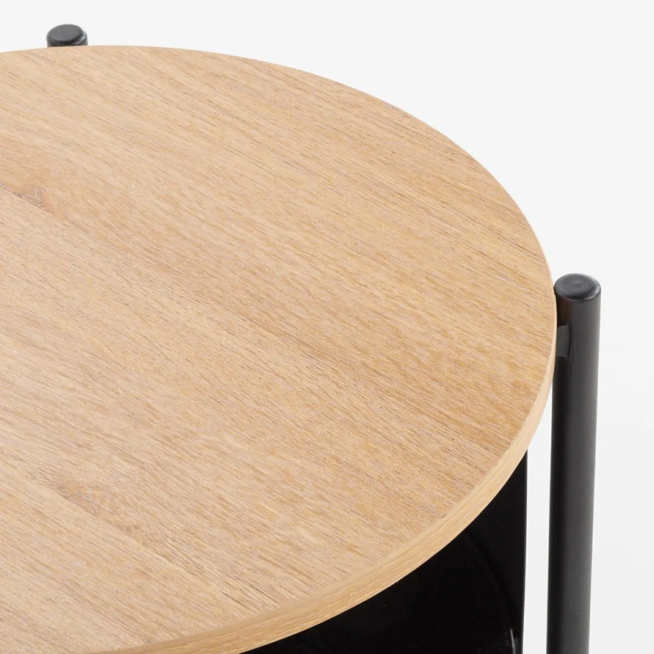 Stolik HILTO wpisuje się w stylistykę nowoczesnych i industrialnych wnętrz. Konstrukcja łączy czarny metal z jasną i ciemną imitacją drewna, tworząc ciekawy kontrast, a okrągły kształt wprowadza łagodzi surowe linie aranżacyjne.
