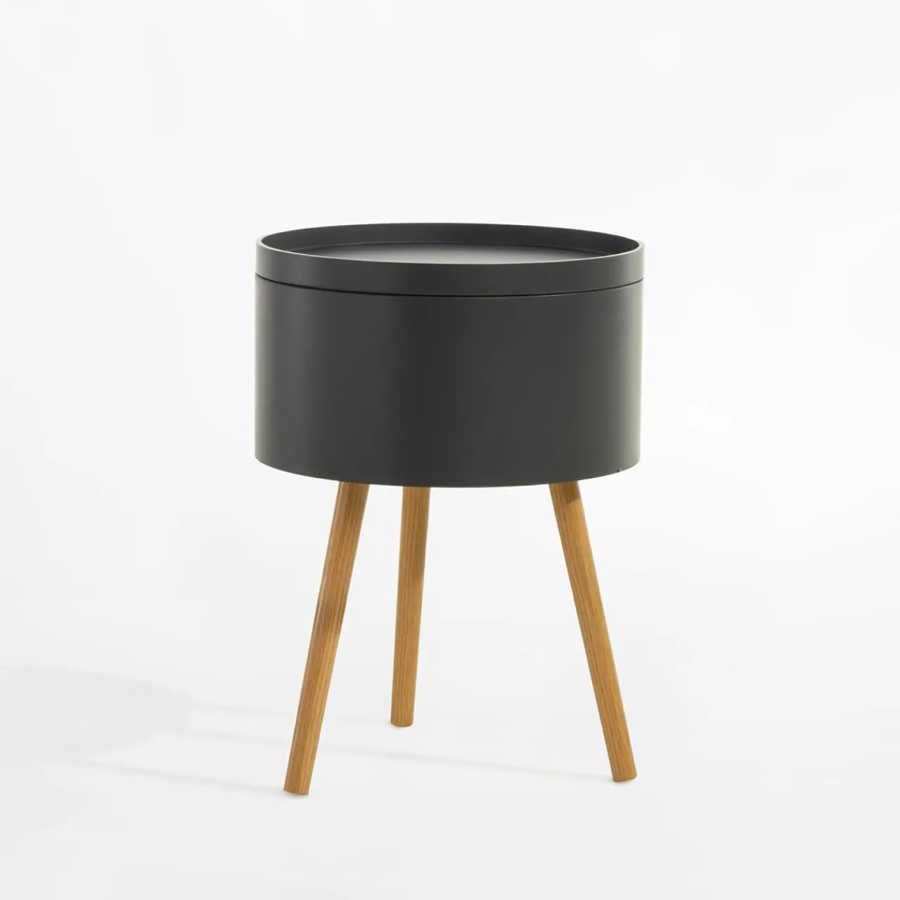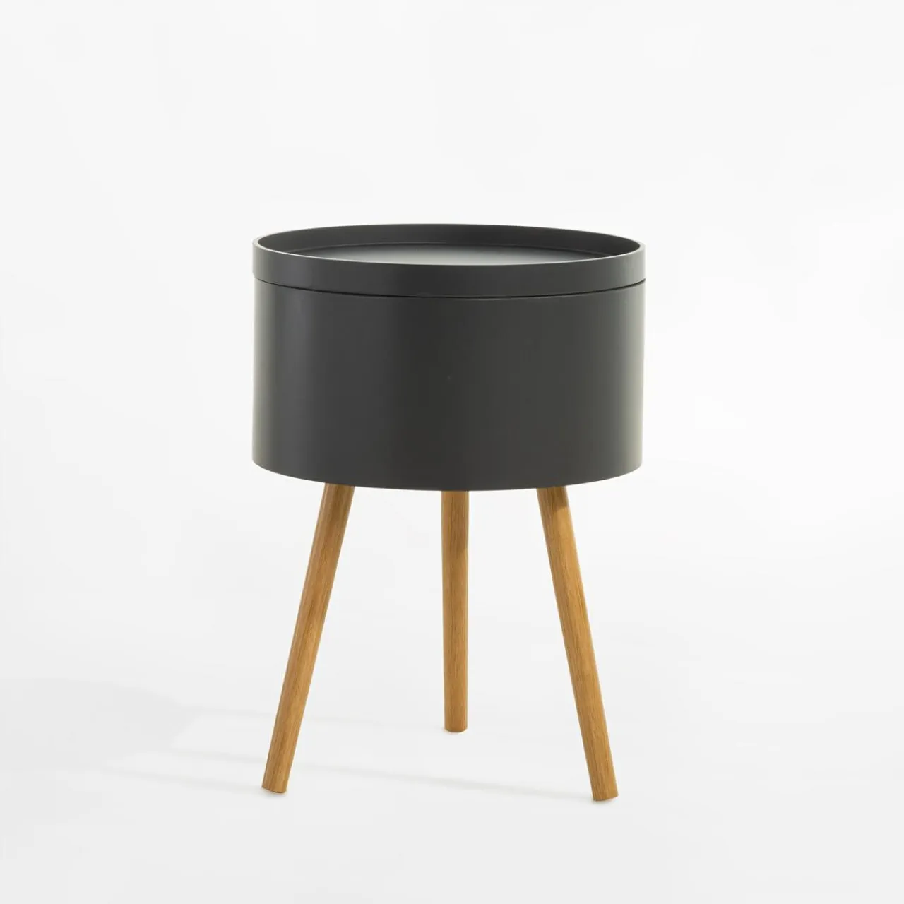 Stolik ze schowkiem to stylowy dodatek, który zapewni Ci miejsce do przechowywania. Ciemny odcień szarości prezentuje się elegancko i podkreśli nowoczesny styl aranżacji. Nogi z prawdziwego drewna wprowadzą naturalny akcent do wnętrza.
