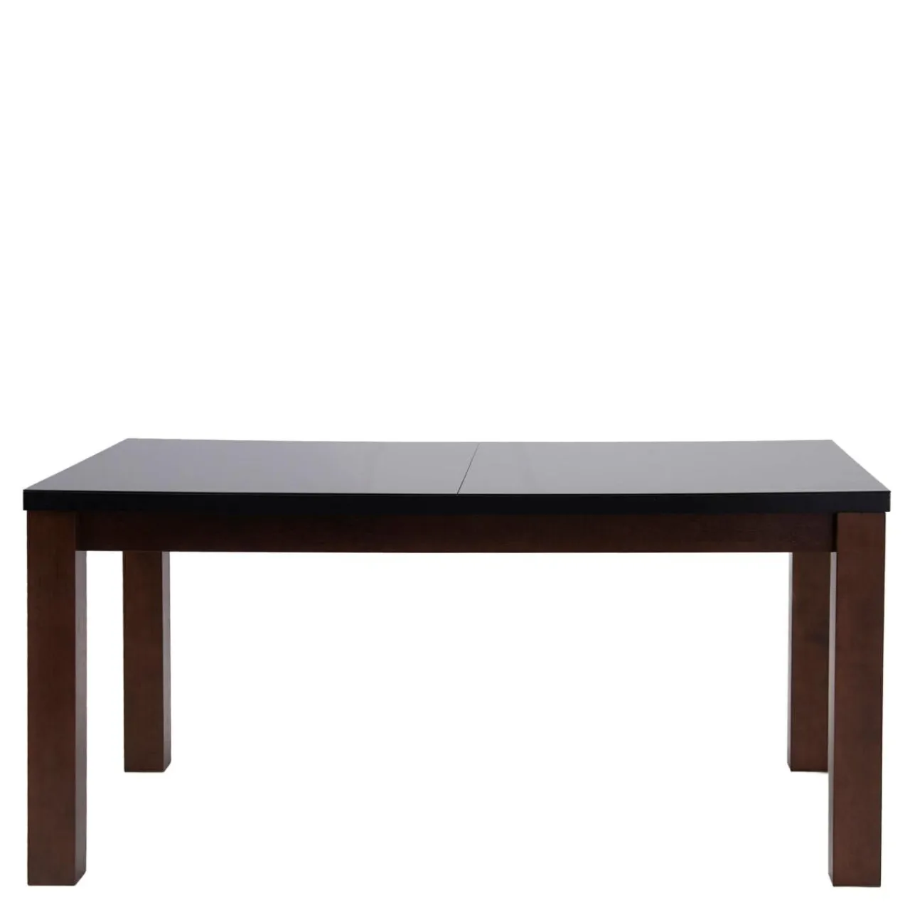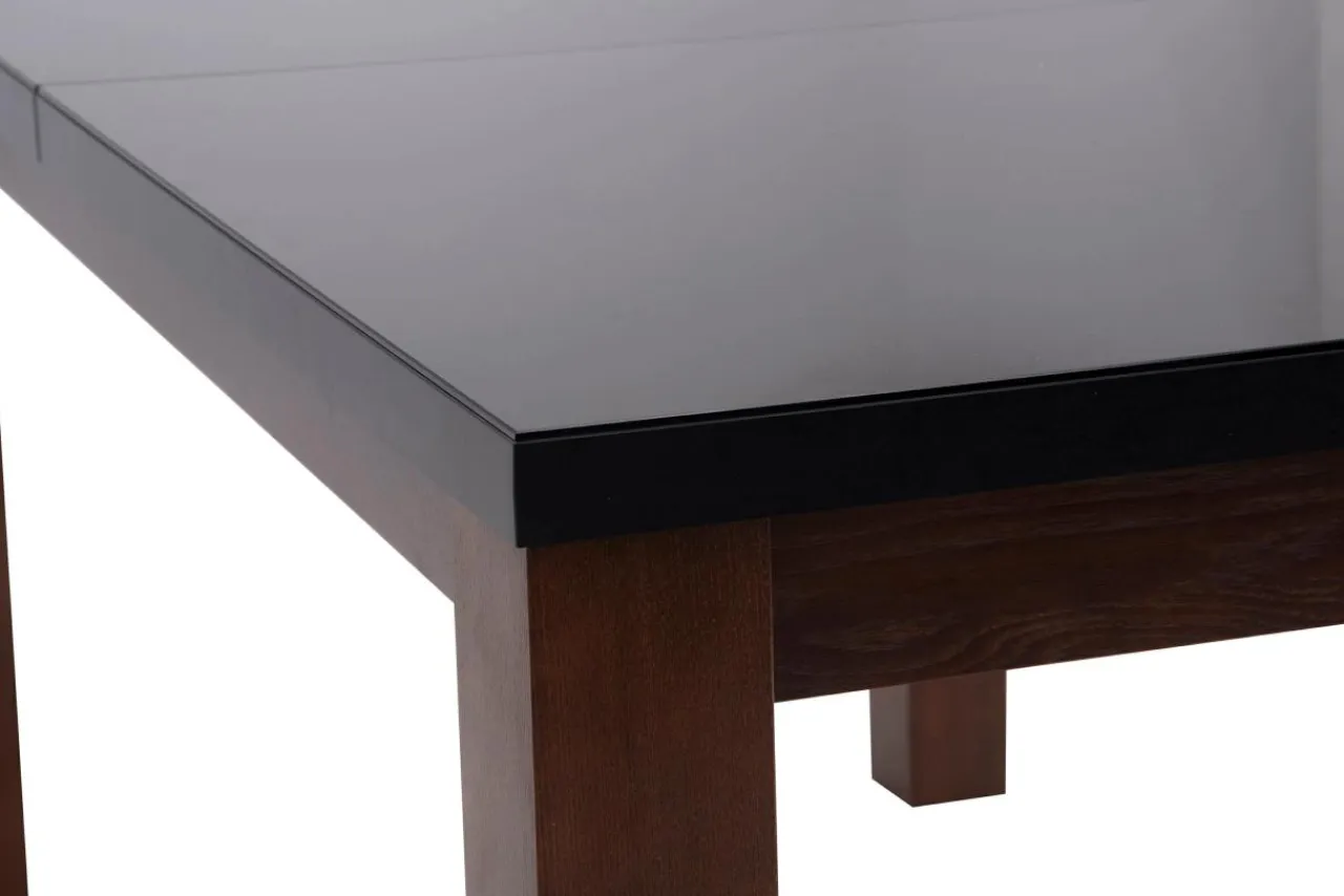 Czarne szkło na blacie, które pięknie odbija światło wpadające do pomieszczenia, idealnie koresponduje z brązowym odcieniem naturalnego drewna, z którego wykonane są nogi stołu.