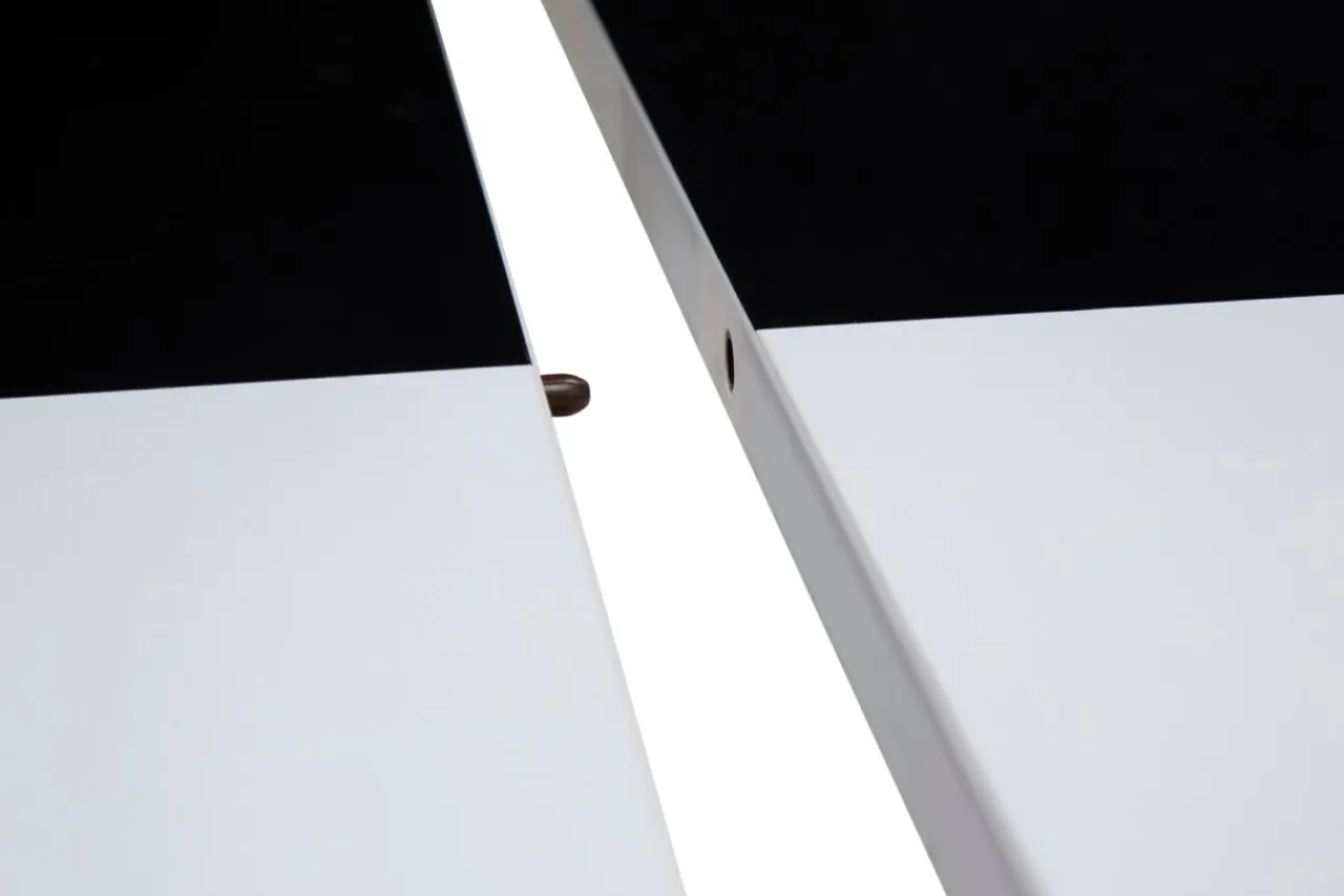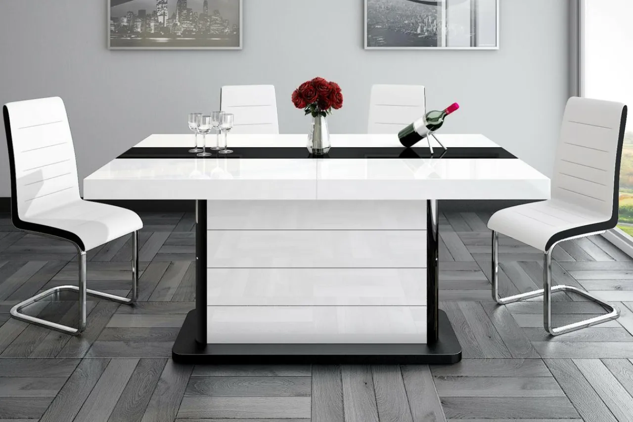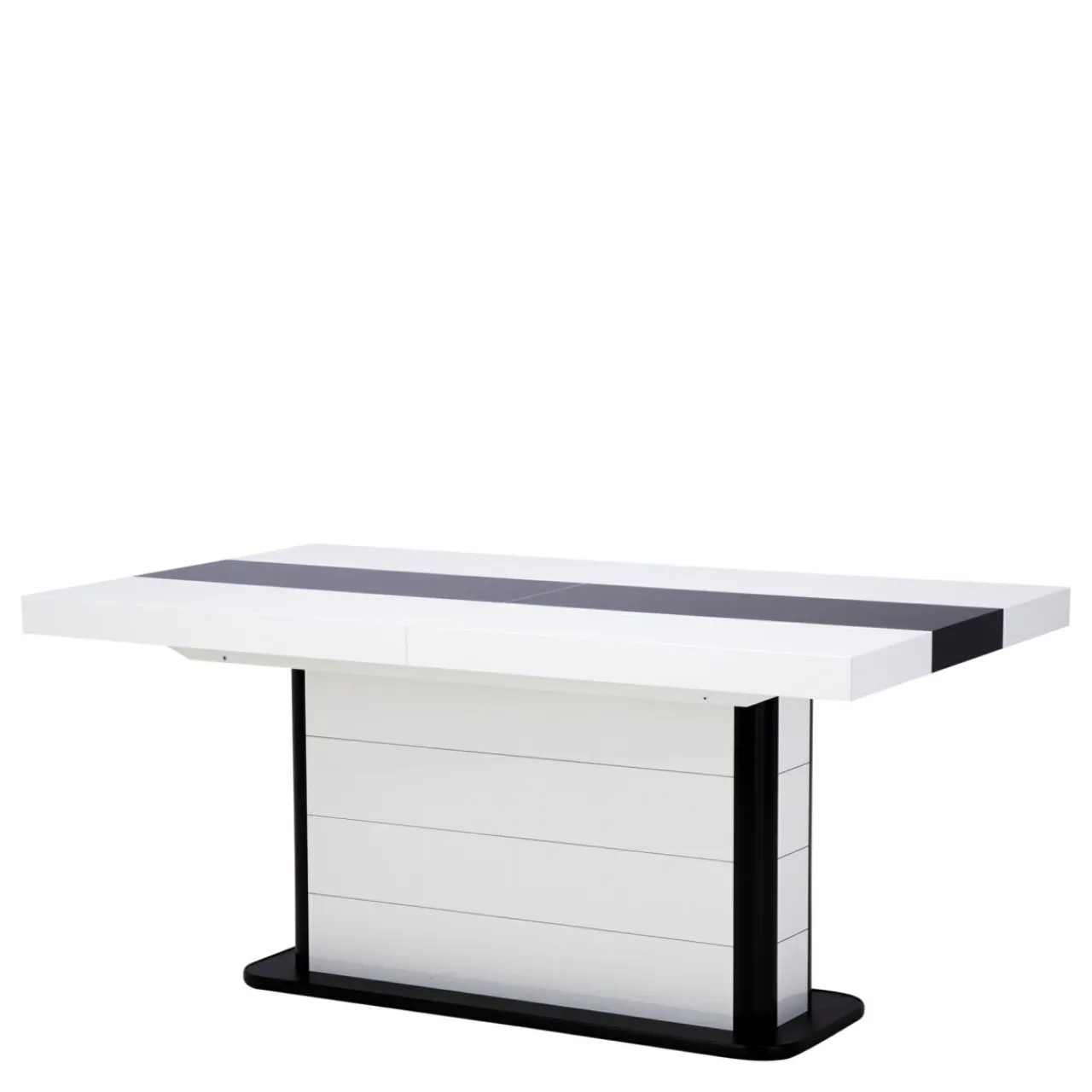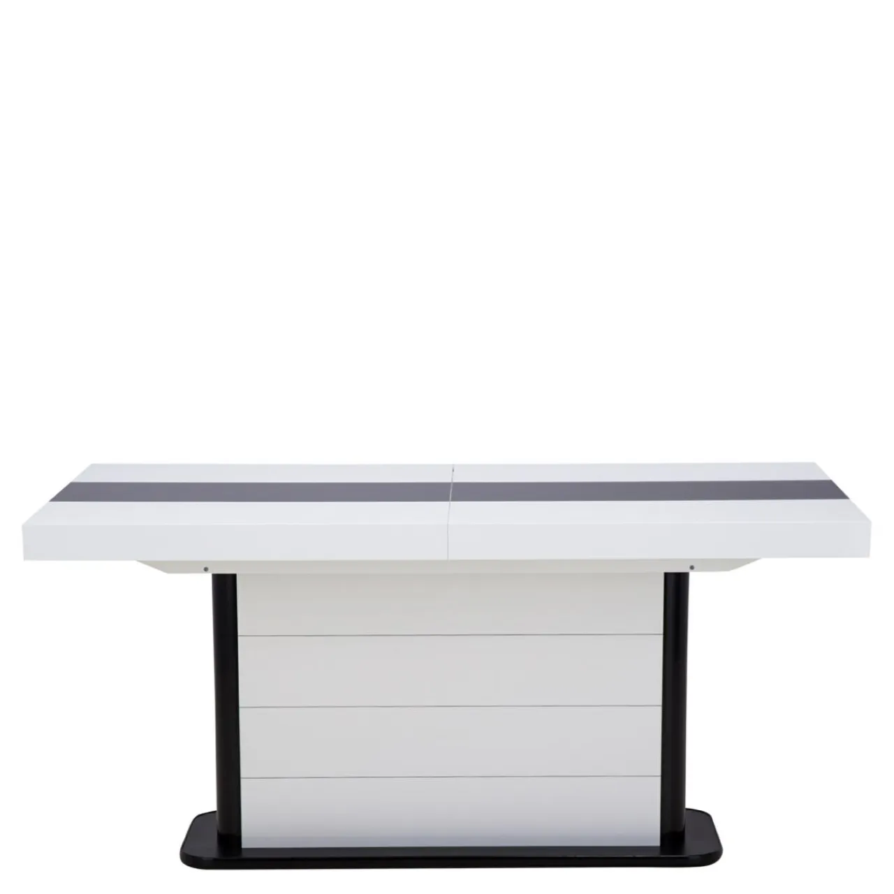 Biały stół PIANOSA rozkładany na kolumnowej podstawie z czarnymi elementami, które podkreślają jego nowoczesny charakter. Prosta forma i kontrastowy zestaw kolorów z pewnością zachwyci cię prostym wyglądem. Podpora blatu sprawia, że możesz wygodnie zająć miejsce przy stole.