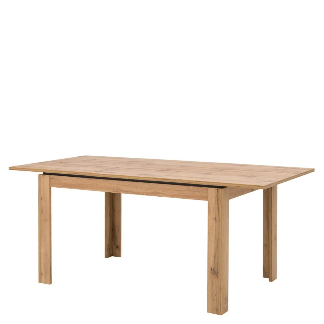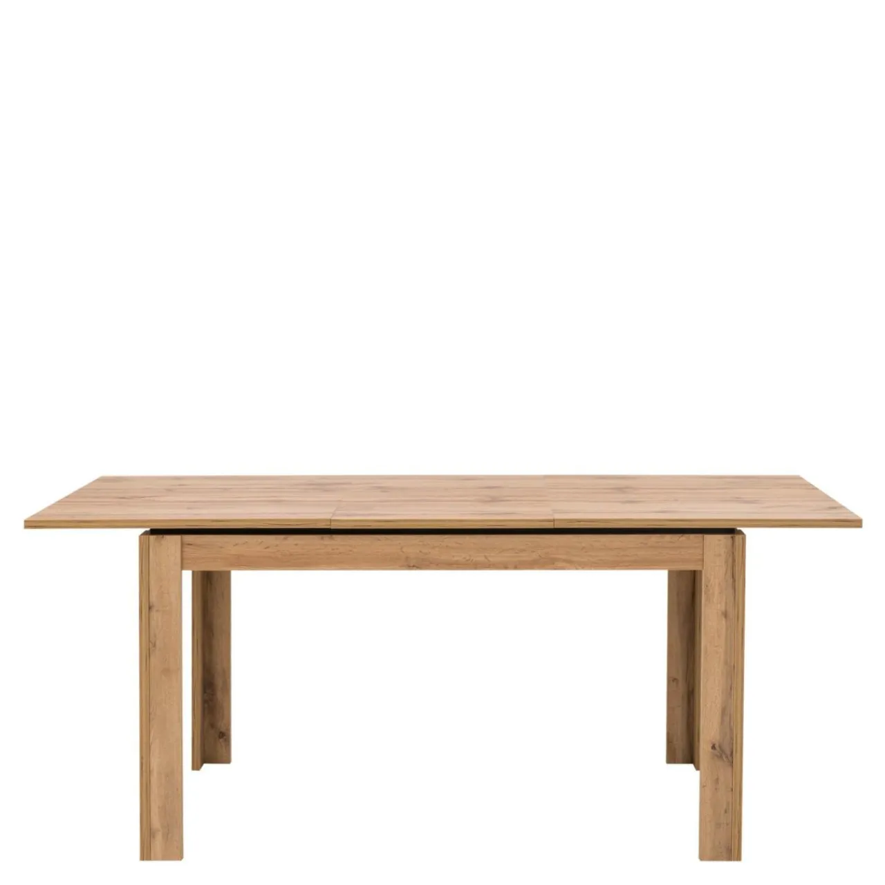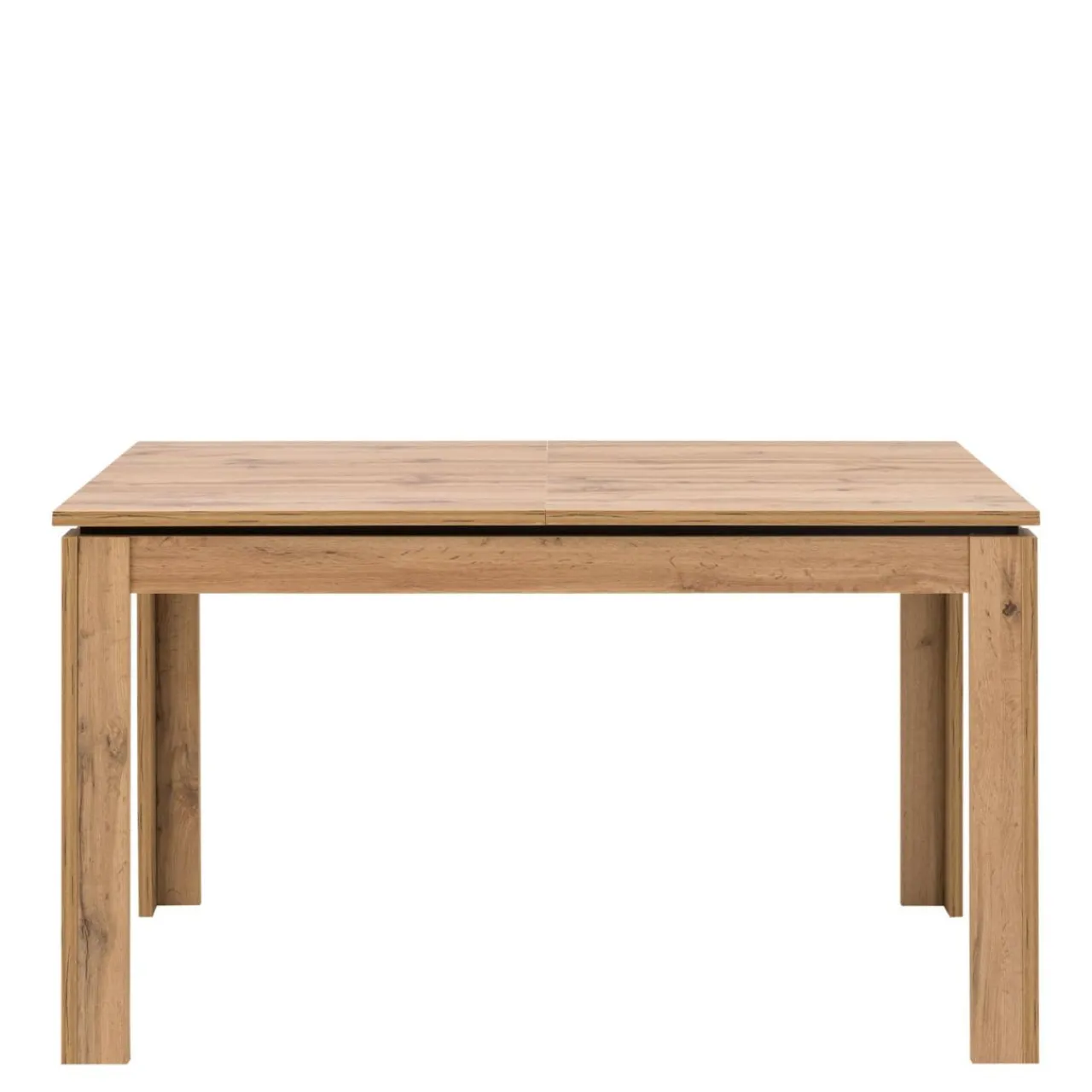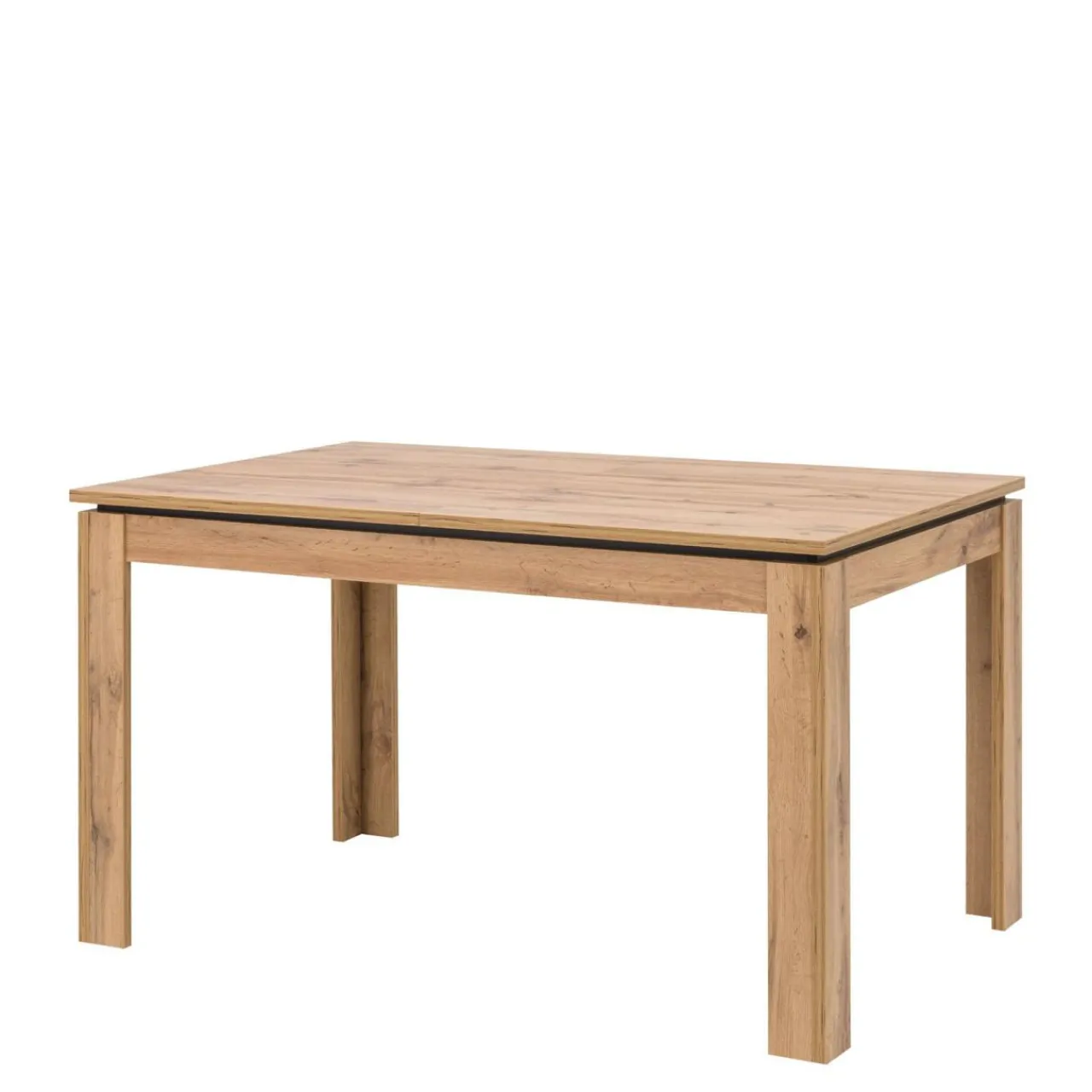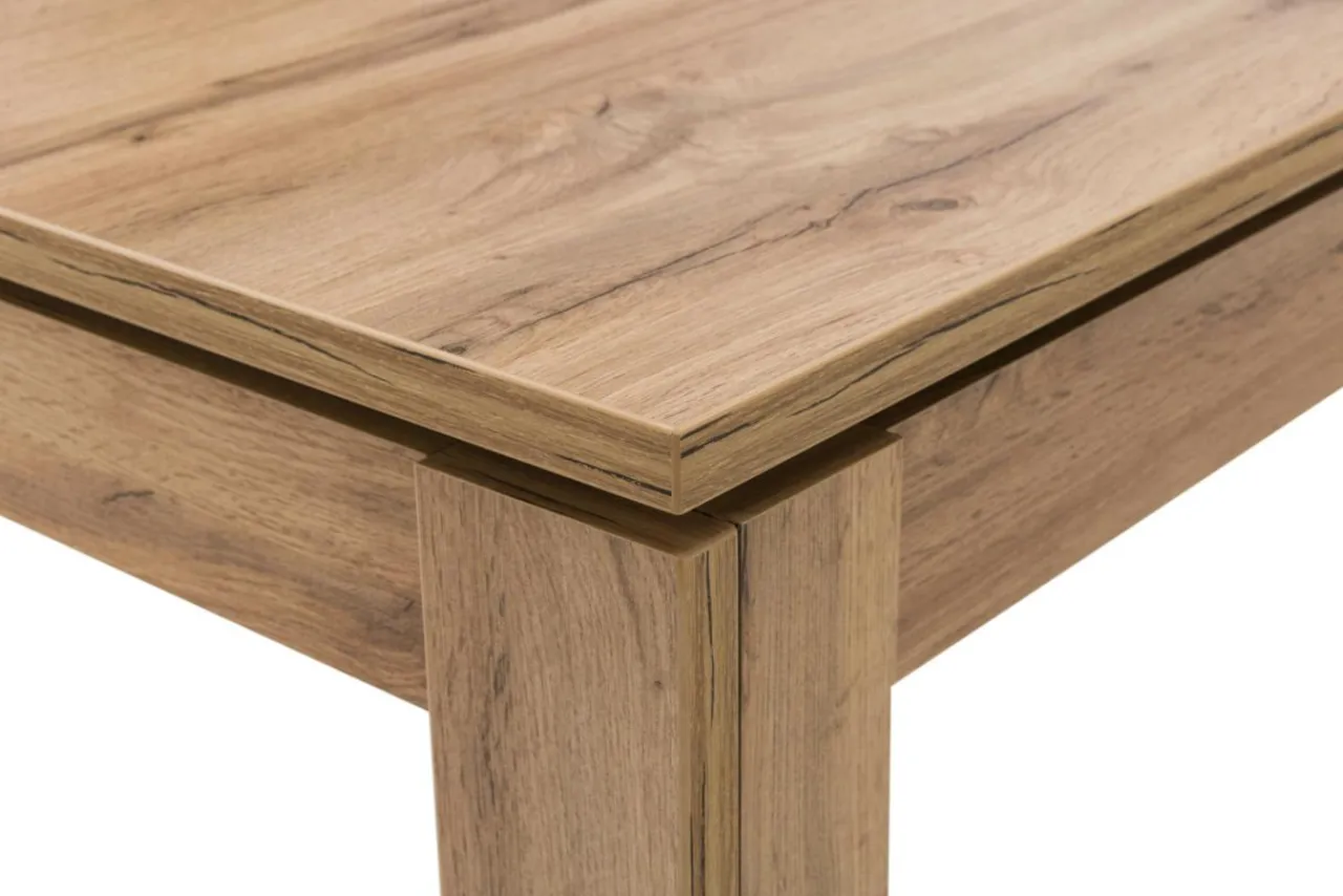 Stół wykończono laminatem, imitującym strukturę drewna o ciepłej barwie „dębu wotan”.