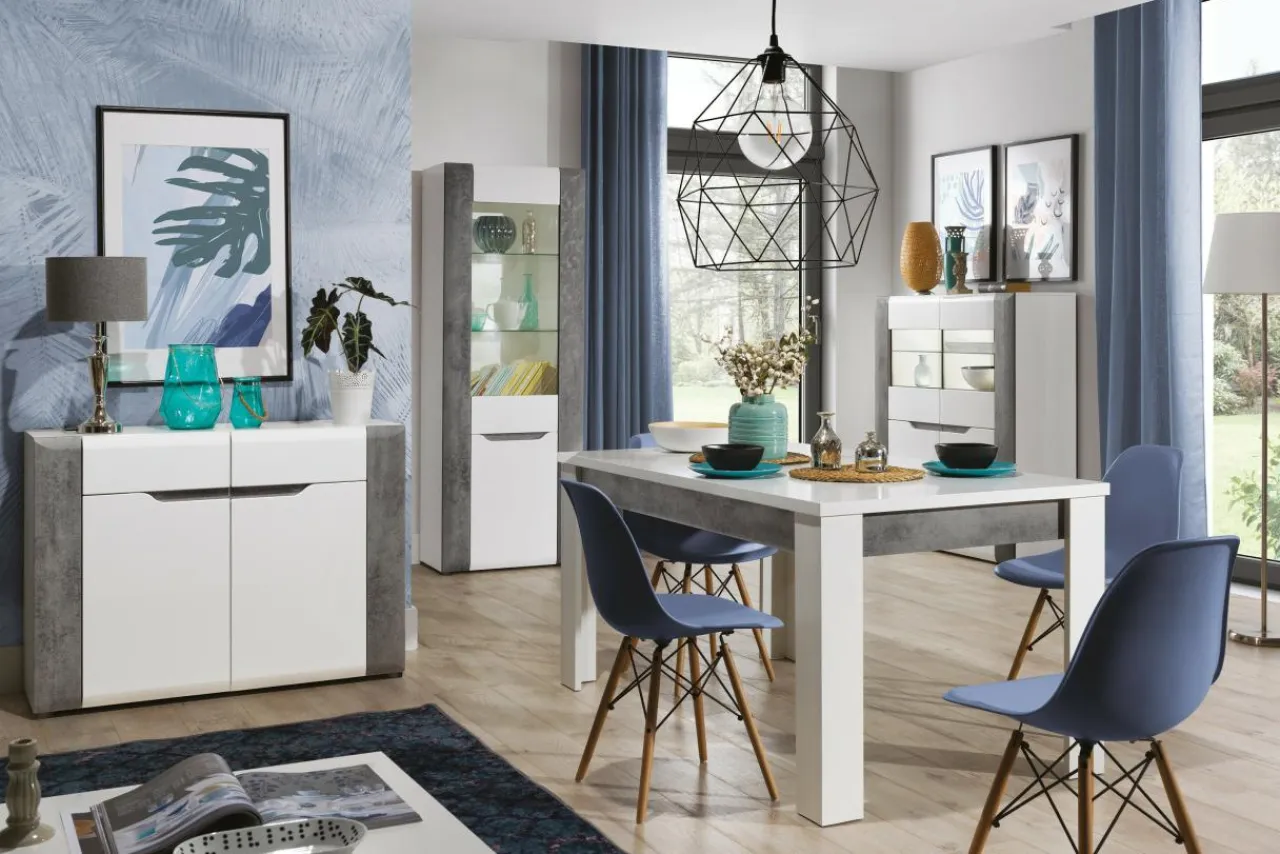 Korpus oraz blat mebla zostały wykonane z laminowanej płyty meblowej. Modne zestawienie bieli oraz szarości betonu dodaje jej nieco surowości. Zwraca uwagę kolorystyką oraz oszczędną, nowoczesną formą.