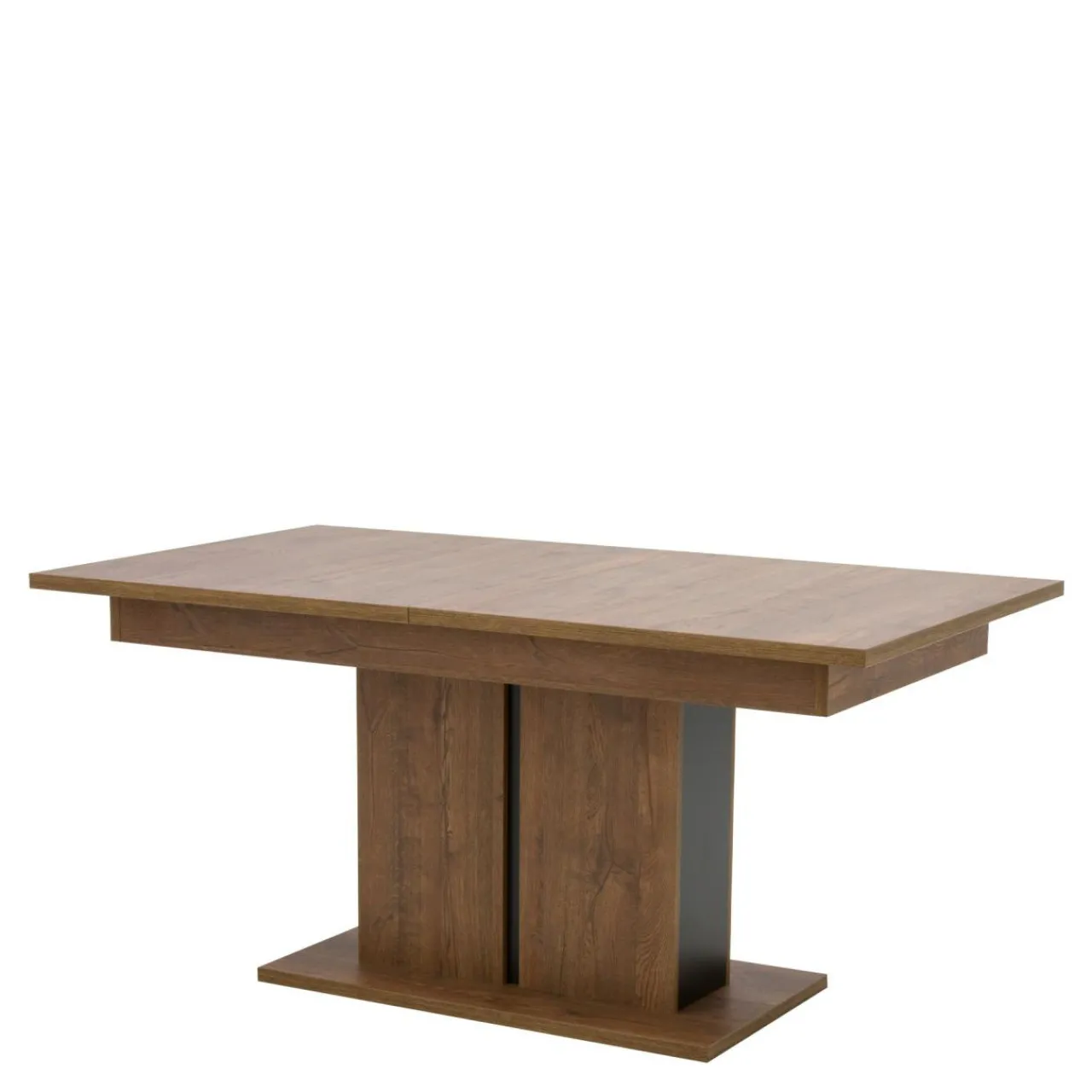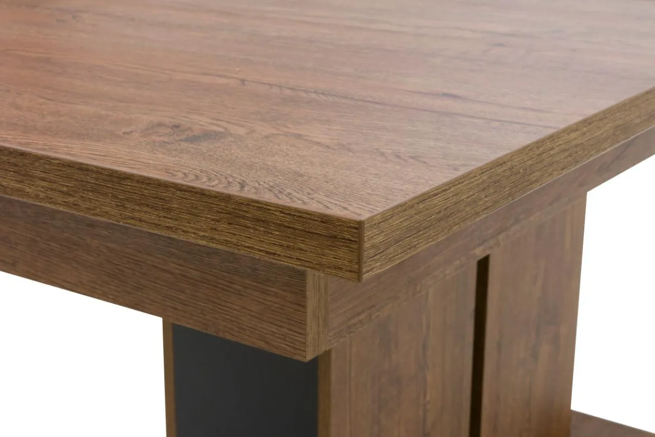 Od strony wizualnej uwagę zwraca kolorystyka mebla w odcieniu dąb april, która została wzbogacona czarnymi wstawkami przy kolumnowej podstawie.