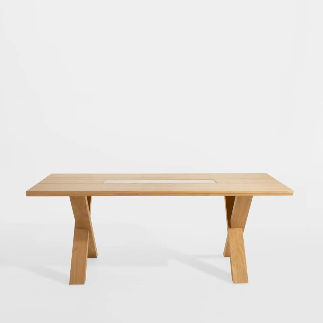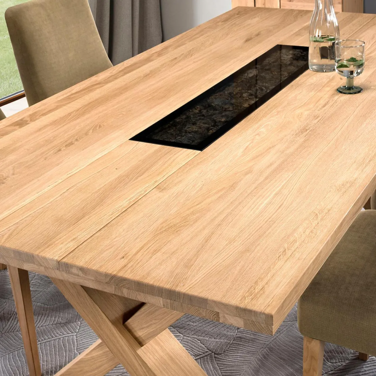 - Piękny bez obrusów — na środku blatu znajduje się przeszklony panel wypełniony korą. Wyjątkowy element sam stanowi dekorację, która zaskoczy siedzących wokół mebla!