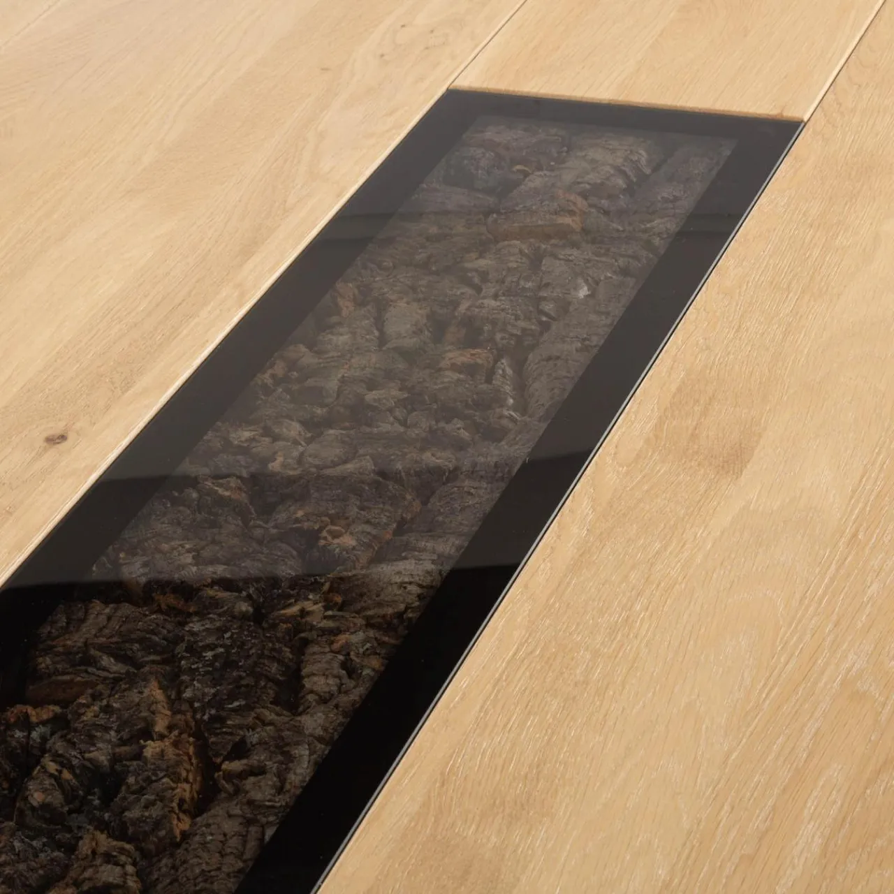 - Półki i witryny wykonane z ciemnego szkła podkreślają naturalne rysunki słojów i osadzoną w głębi korę.