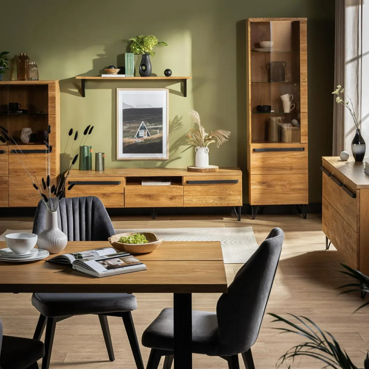 - Fronty z litego drewna dębowego oraz wykończenia mebli z naturalnej okleiny dębowej sprawiają, że meble posiadają niepowtarzalny rysunek drewna.