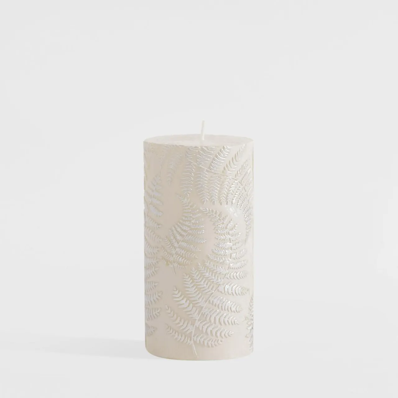 Stylowa świeca walec ozdobiona subtelnym wzorem paproci w eleganckim połączeniu koloru lnu i srebra. Idealna do uzupełnienia dekoracji wnętrza i wprowadzenia przytulnego klimatu.