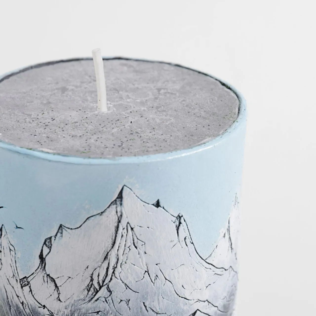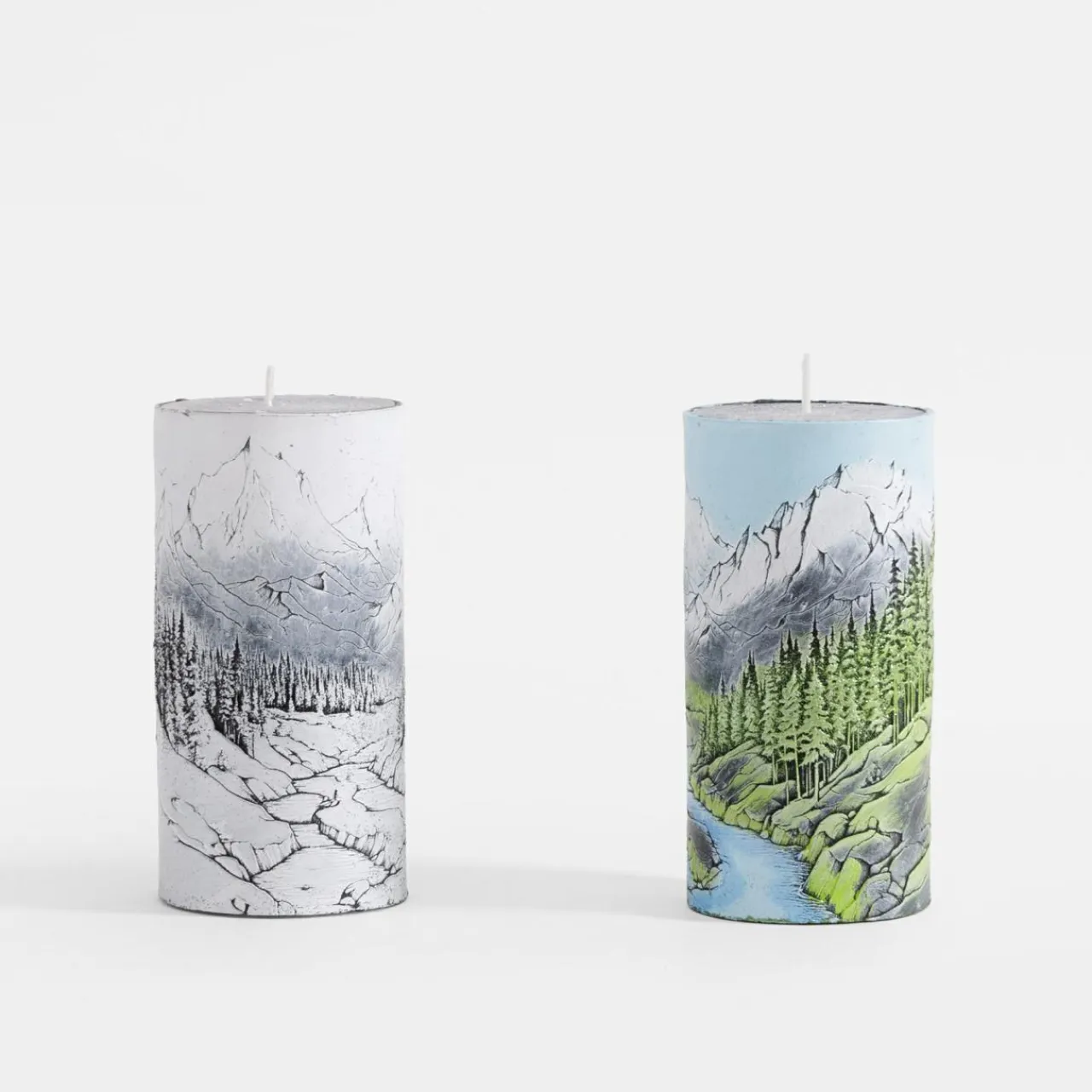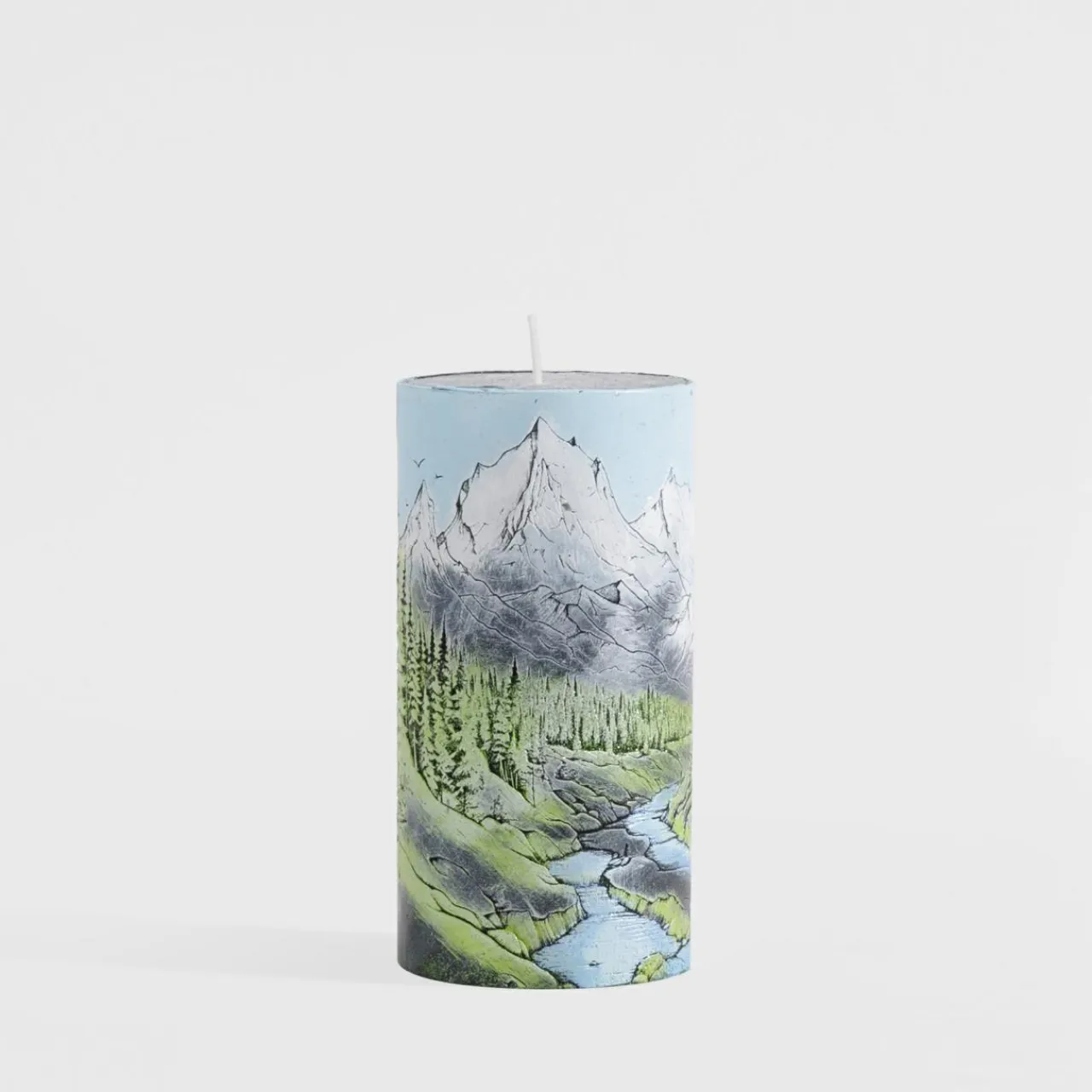Świeca ozdobiona barwnym pejzażem przedstawiającym las i góry, który wnosi do wnętrza naturalny urok. Kolorowy wzór nadaje jej wyjątkowy charakter, przyciągając uwagę i wprowadzając radosny akcent.