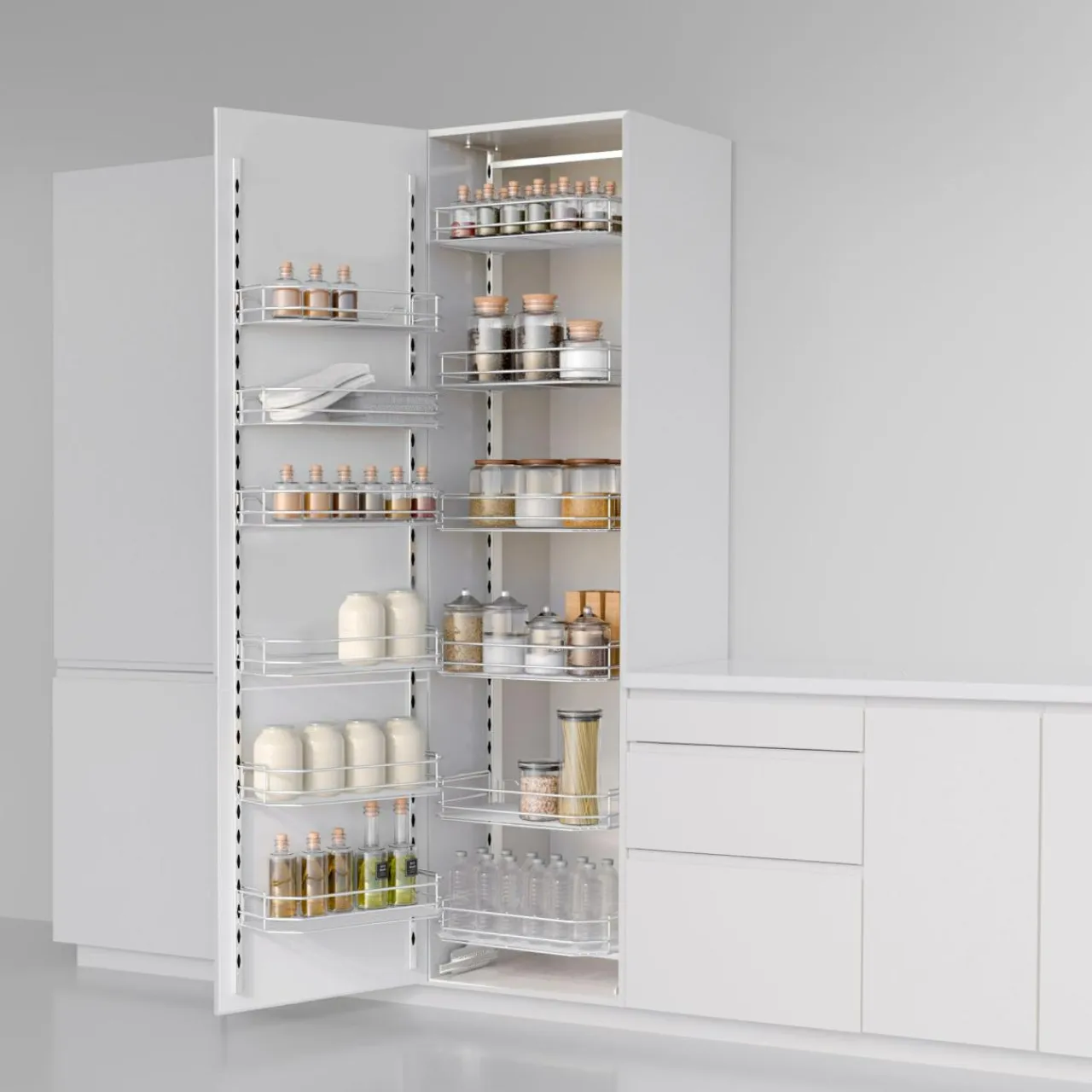 Ten model kuchennego cargo dopasowany został do szafki o szerokości 60 cm i maksymalnej wysokości 240 cm. Zawiera ramę, stelaż i kosze, które zamontujesz wewnątrz szafki oraz na drzwiach.