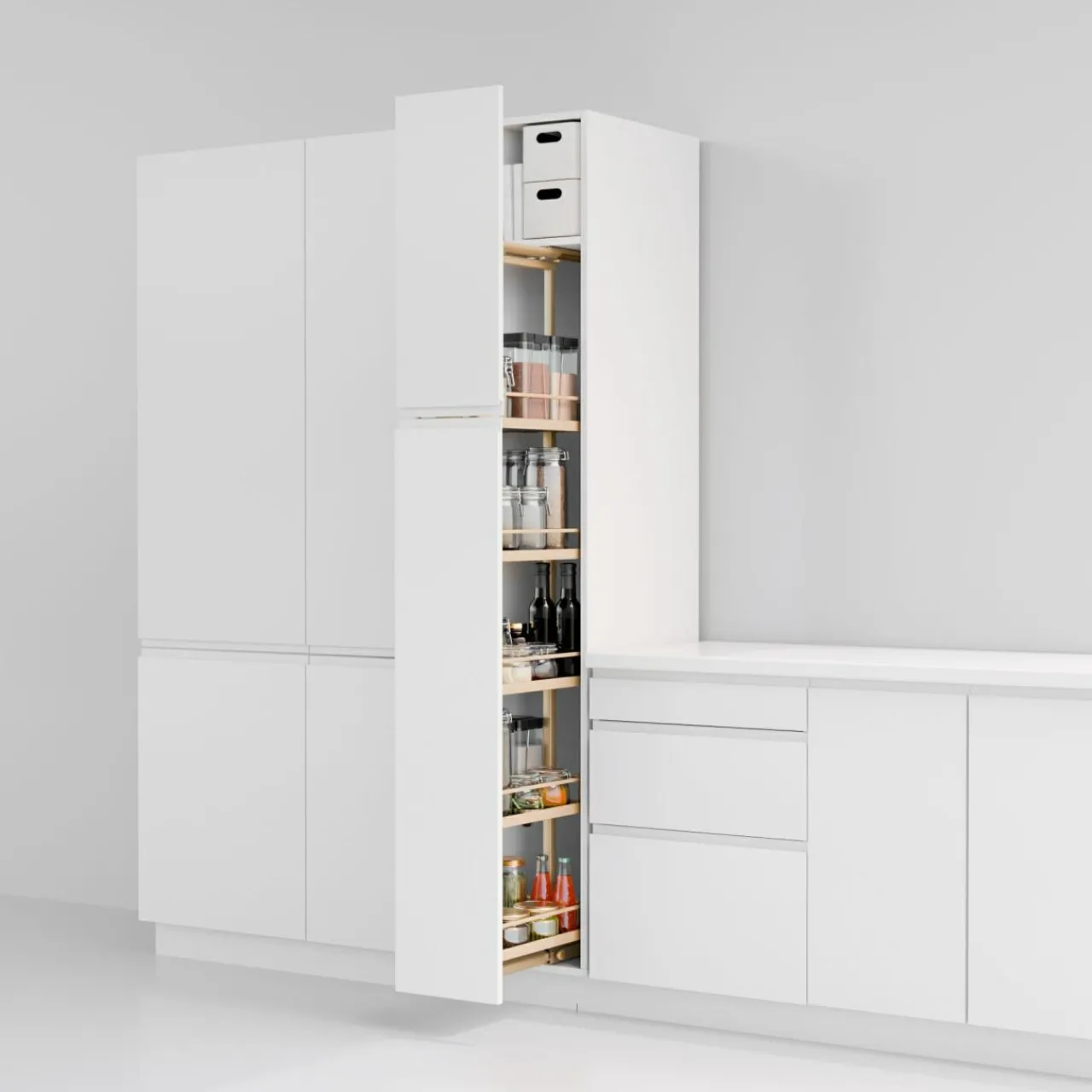 Wysuwane, pionowe szuflady, ruchome koszyki, czy półki montowane w szafkach narożnych pozwalają w intuicyjny sposób wykorzystać przestrzeń w kuchni i skutecznie nią zarządzać.