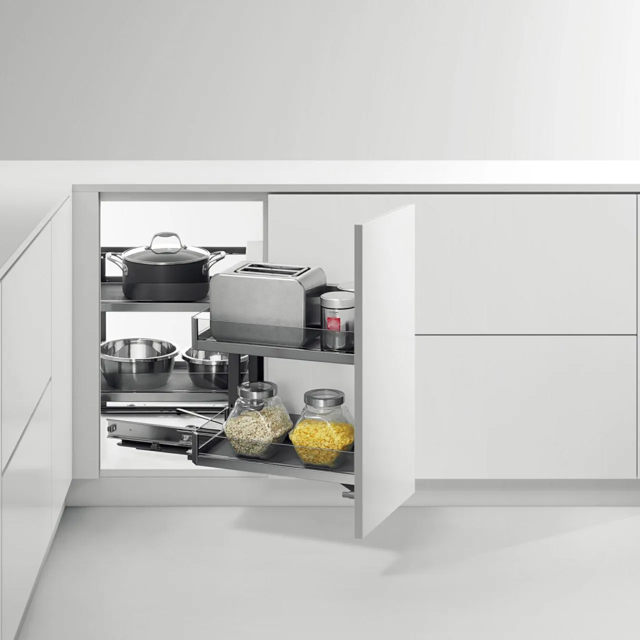 Ta wersja systemu cargo VORTUNG jest przeznaczona do szafek narożnych. Nie zawiera koszy – należy je dokupić osobno.