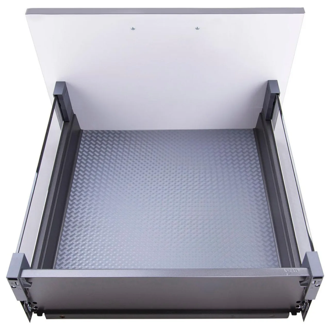 Niniejszy model szuflady INSIDE SYSTEM BOX został przeznaczony do montażu z wysokim frontem o szerokości 40 cm. Jej ciemny, antracytowy kolor podkreśla nowoczesny design oraz szklane uzupełnienie przy bokach. Sprawia, że pasuje do wykończenia w odcieniach czerni i szarości.