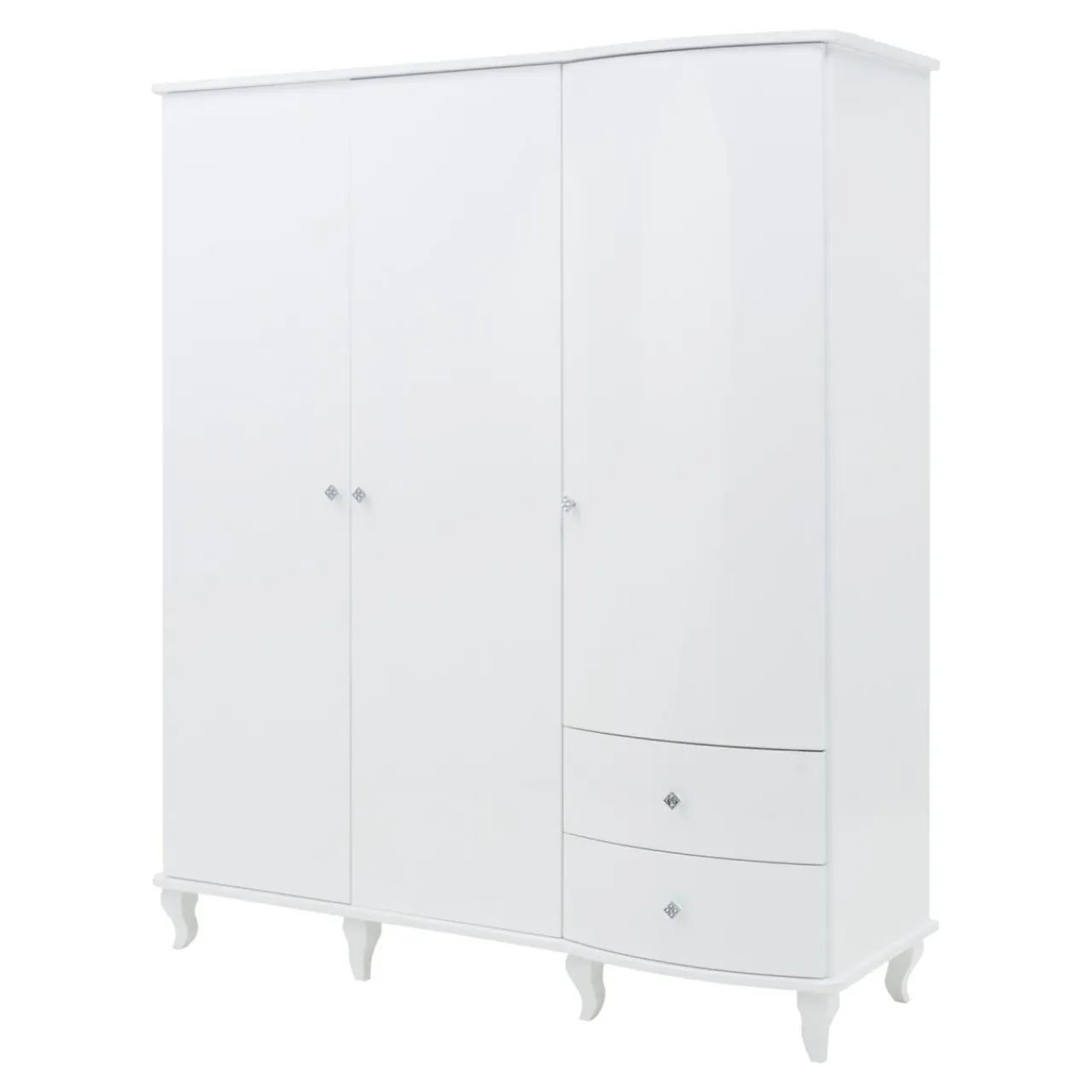 Szafa została wykończona białym lakierem w wysokim połysku, ozdobne nóżki są wykonane z litego drewna, uchwyty są zdobione kryształkami.