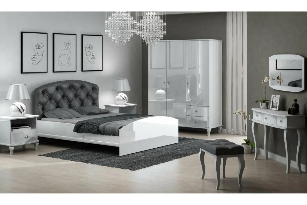Staranne wykończenie szafy, z dbałością o każdy szczegół sprawia, że będzie ozdobą sypialni. Białe błyszczące fronty sprawdzą się w pomieszczeniach, w których jest niewiele światła, optycznie je rozjaśniając.