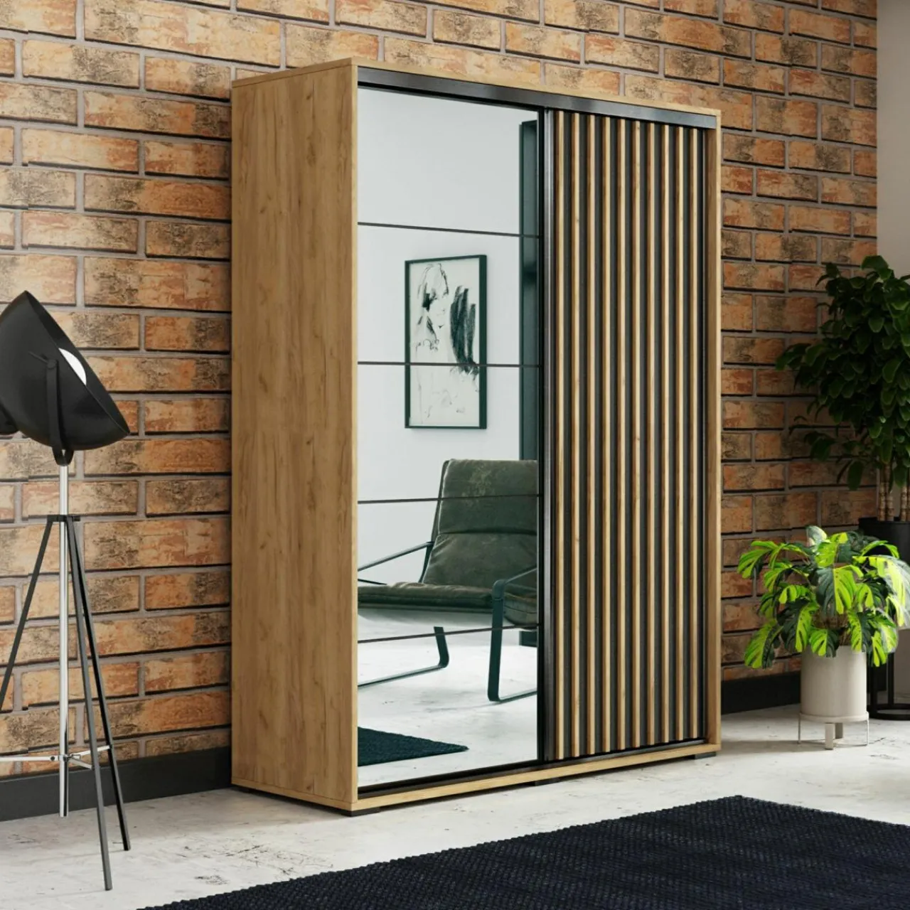 Szafa przesuwna z lamelami i lustrem LIMA pomoże zorganizować zarówno wieszaki z sukienkami, koszulami czy płaszczami, jak i poskładane ubrania.