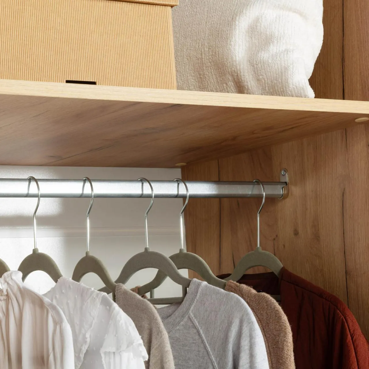 - Z prawej części szafy znajdują się 2 drążki, które pomieszczą odzież wierzchnią oraz wyprasowane ubrania.
