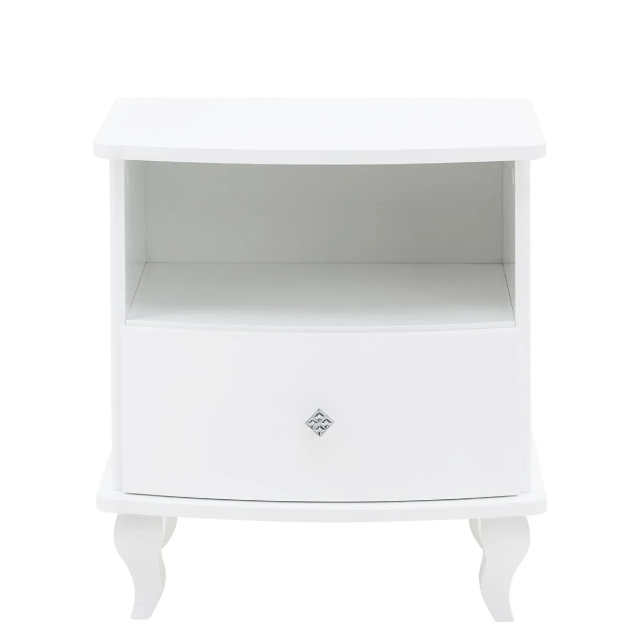 Szafka została wykończona białym lakierem w wysokim połysku, ozdobne nóżki są wykonane z litego drewna, uchwyt jest zdobiony kryształkami.