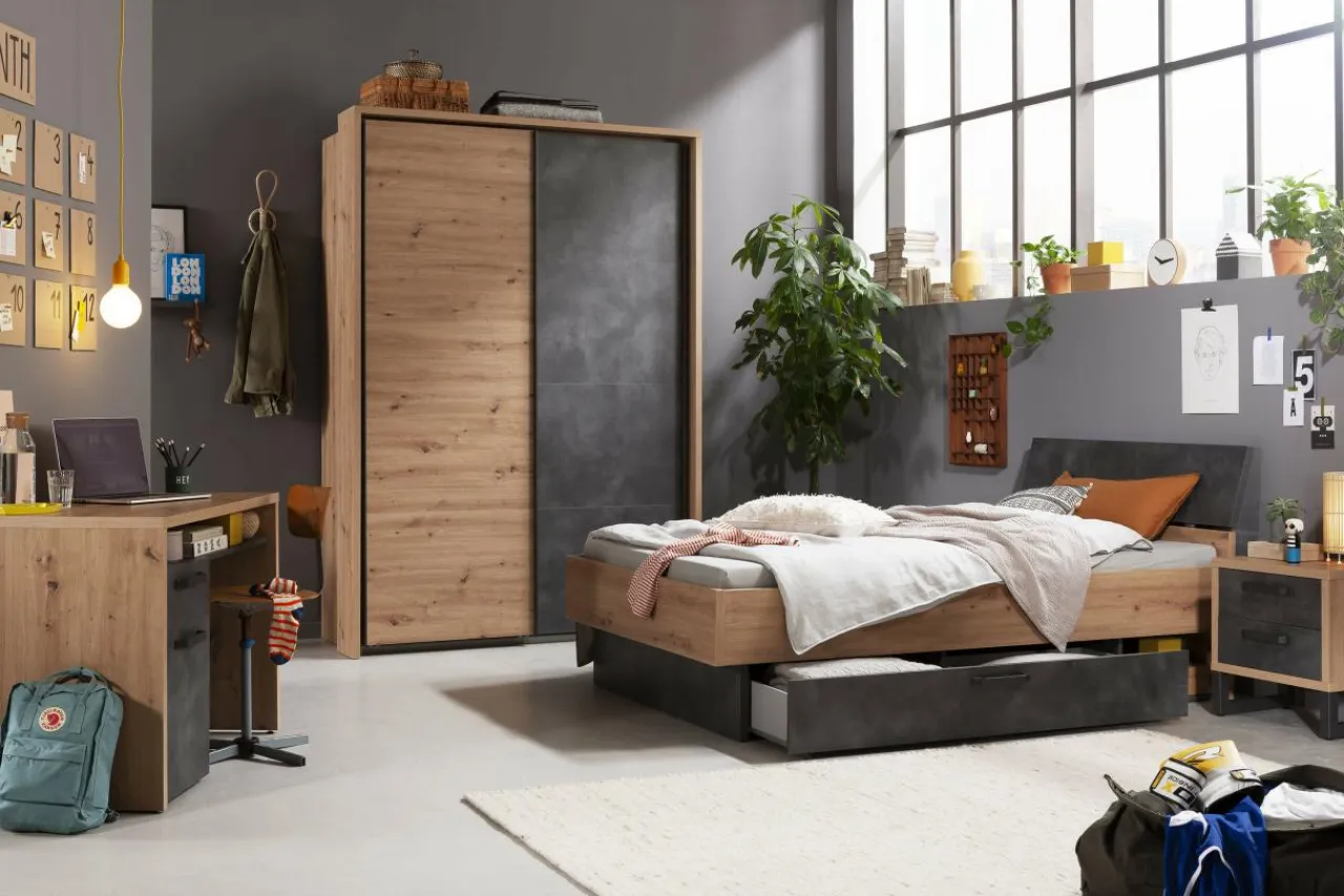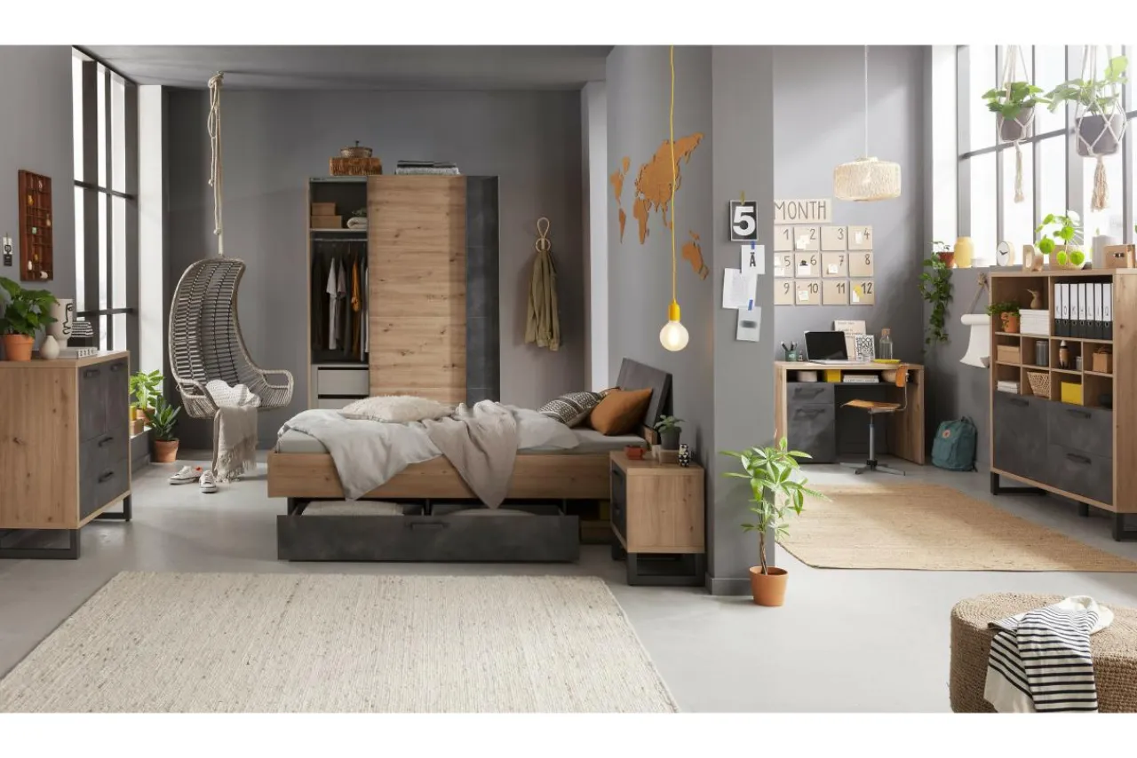- Mebel jest wykończony melaminą w połączeniu kolorów dąb artisan i ciemnoszarym, imitującym surowy beton. Melamina ma bardzo przyjemną w dotyku, gładką teksturę oraz łatwo utrzymać ją w czystości;