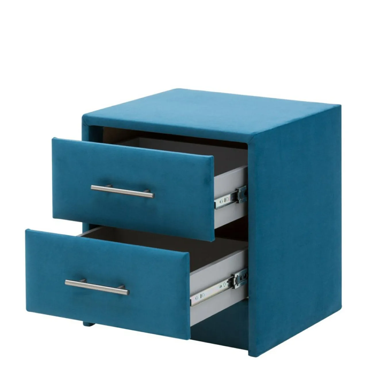 Mebel pokryto tapicerką w niezwykłym, błękitnym kolorze o lazurowym odcieniu. Miękka i miła w dotyku tkanina, stanowiąca wykończenie szafki, idealnie wkomponuje się w aranżację Twojego królestwa snów.