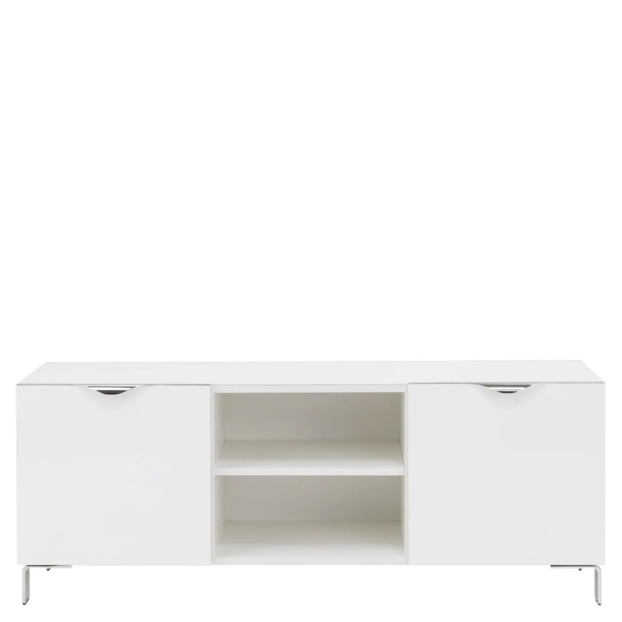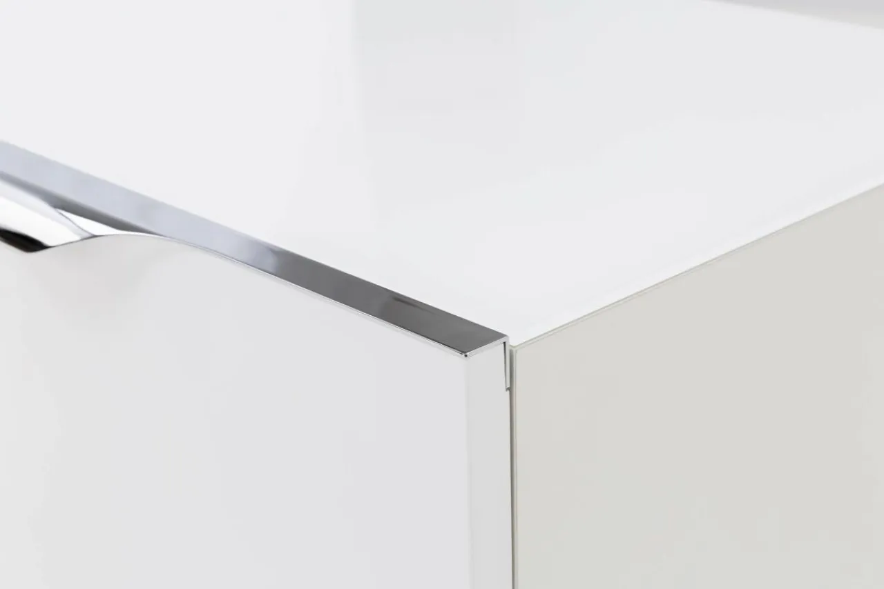 Fronty komody wykończono połyskującym lakierem, który tworzy gładką taflę i powiększa optycznie przestrzeń.