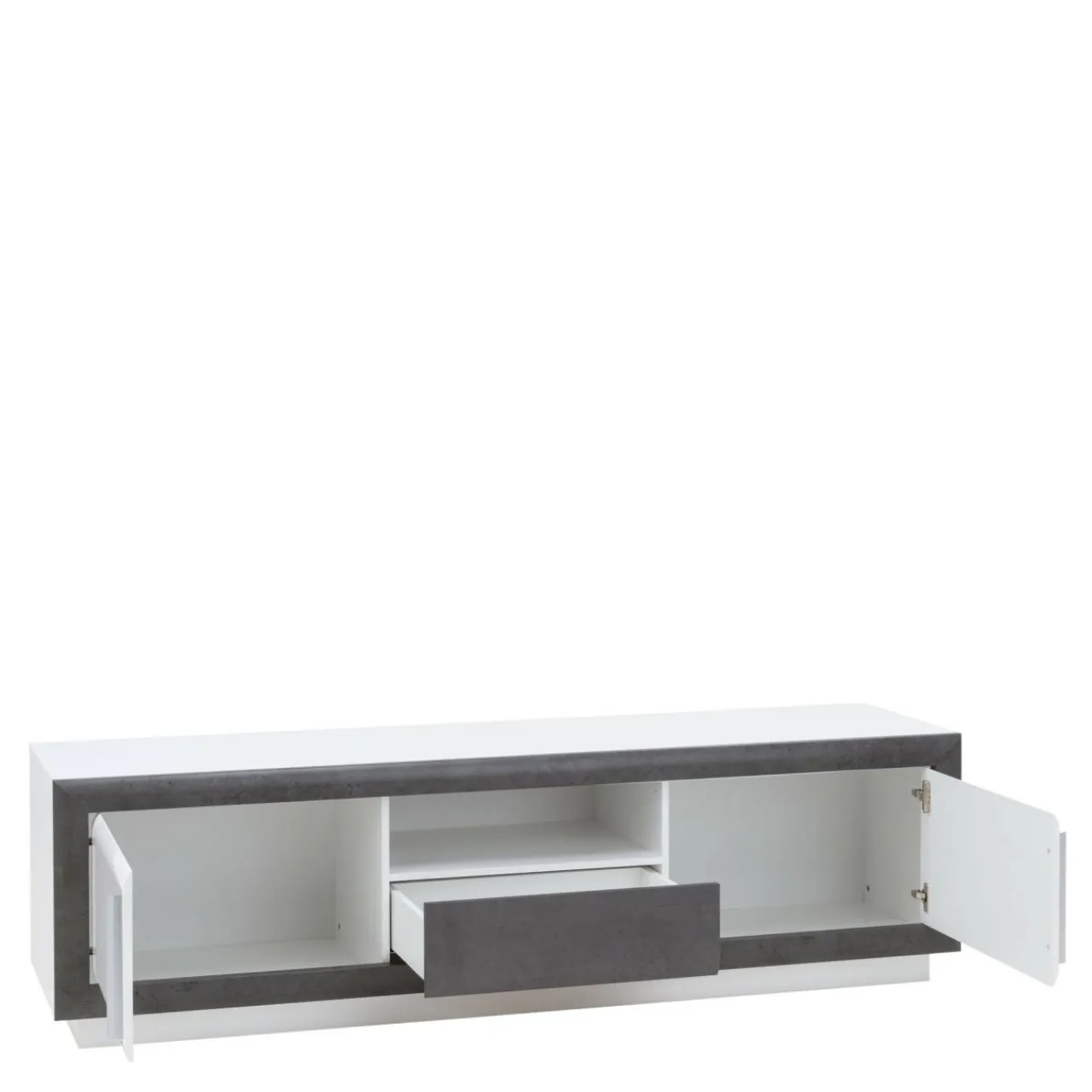 Szafkę zorganizowano standardowo, dwie zamykane szafki, jedna szuflada i wnęka na sprzęt.