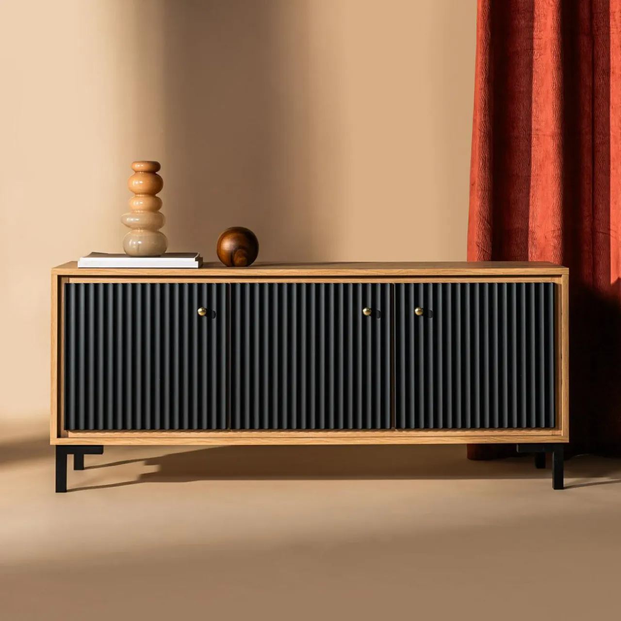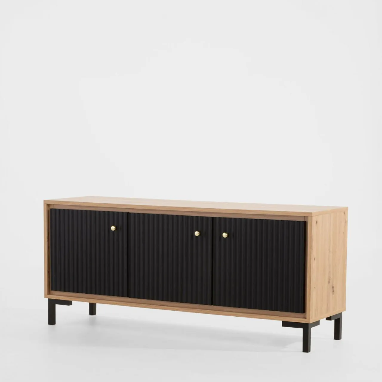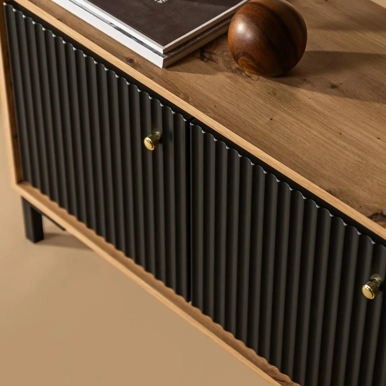 Fronty z ryflowaniem oraz korpus w wybarwieniu dąb artisan sprawiają, że meble wpasowują się w nowoczesne trendy.