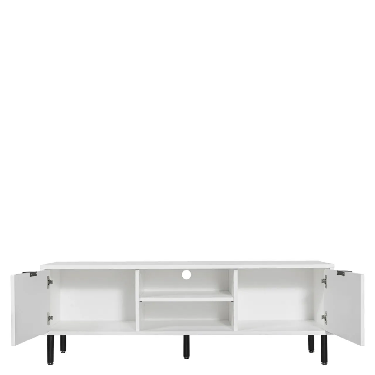 Biała szafka RTV z kolekcji WAVE wyróżnia się efektownym ryflowaniem i wysokimi, czarnymi nogami.
