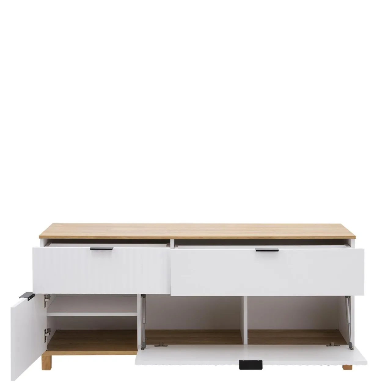 - Korpus oraz dół szafki RTV wykończono laminatem w białym oraz dębowym kolorze.