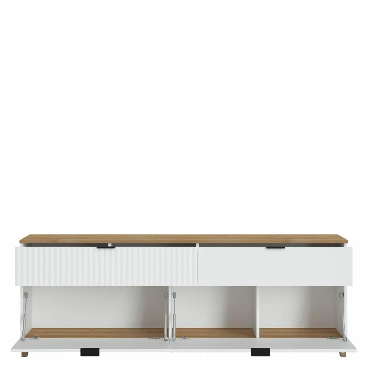 - Korpus oraz dół szafki RTV wykończono laminatem w białym oraz dębowym kolorze.