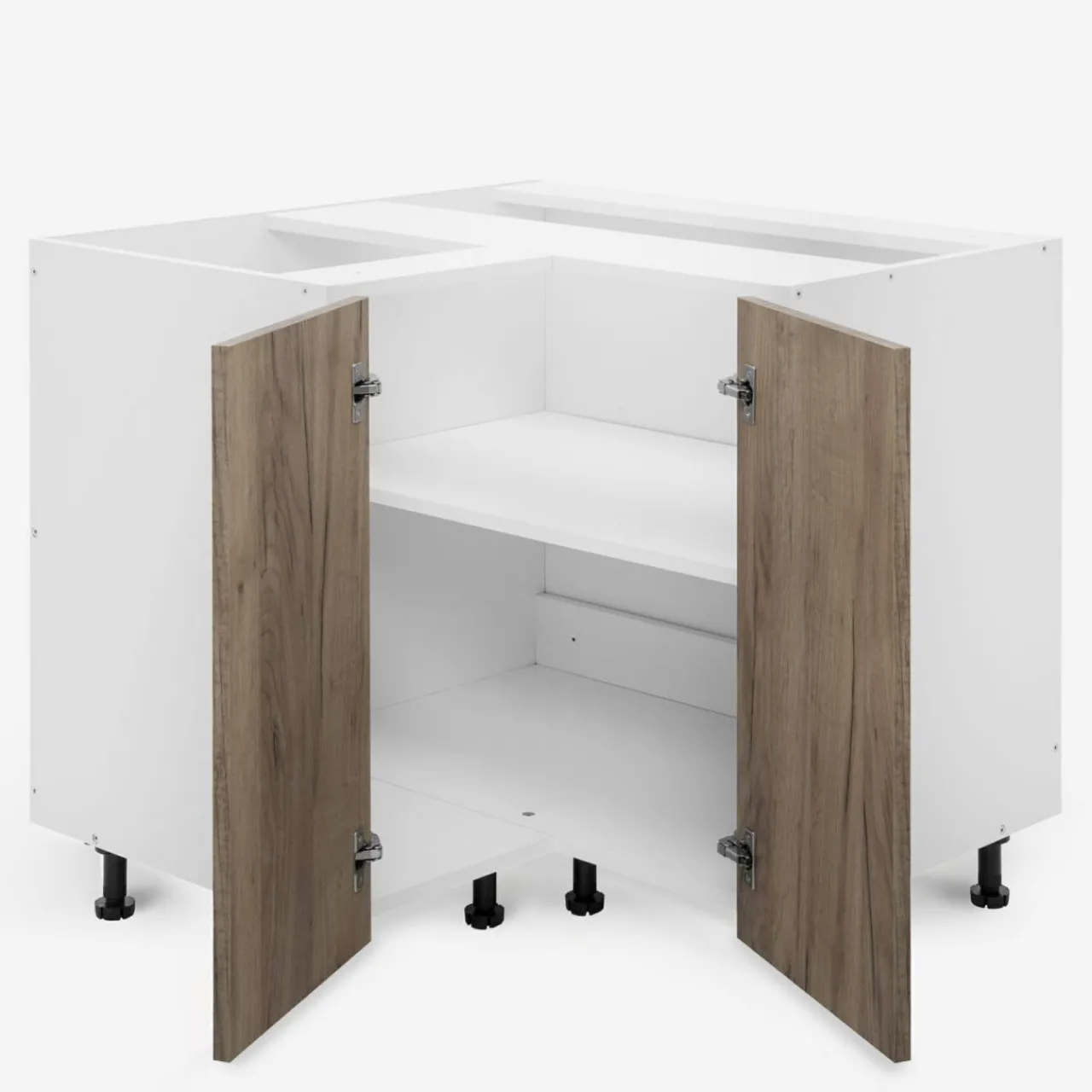 - Dodatkowe możliwości dopasowania szafek stwarzają regulowane nóżki w szafkach dolnych oraz zawieszki ułatwiające poziomowanie przy szafkach górnych.