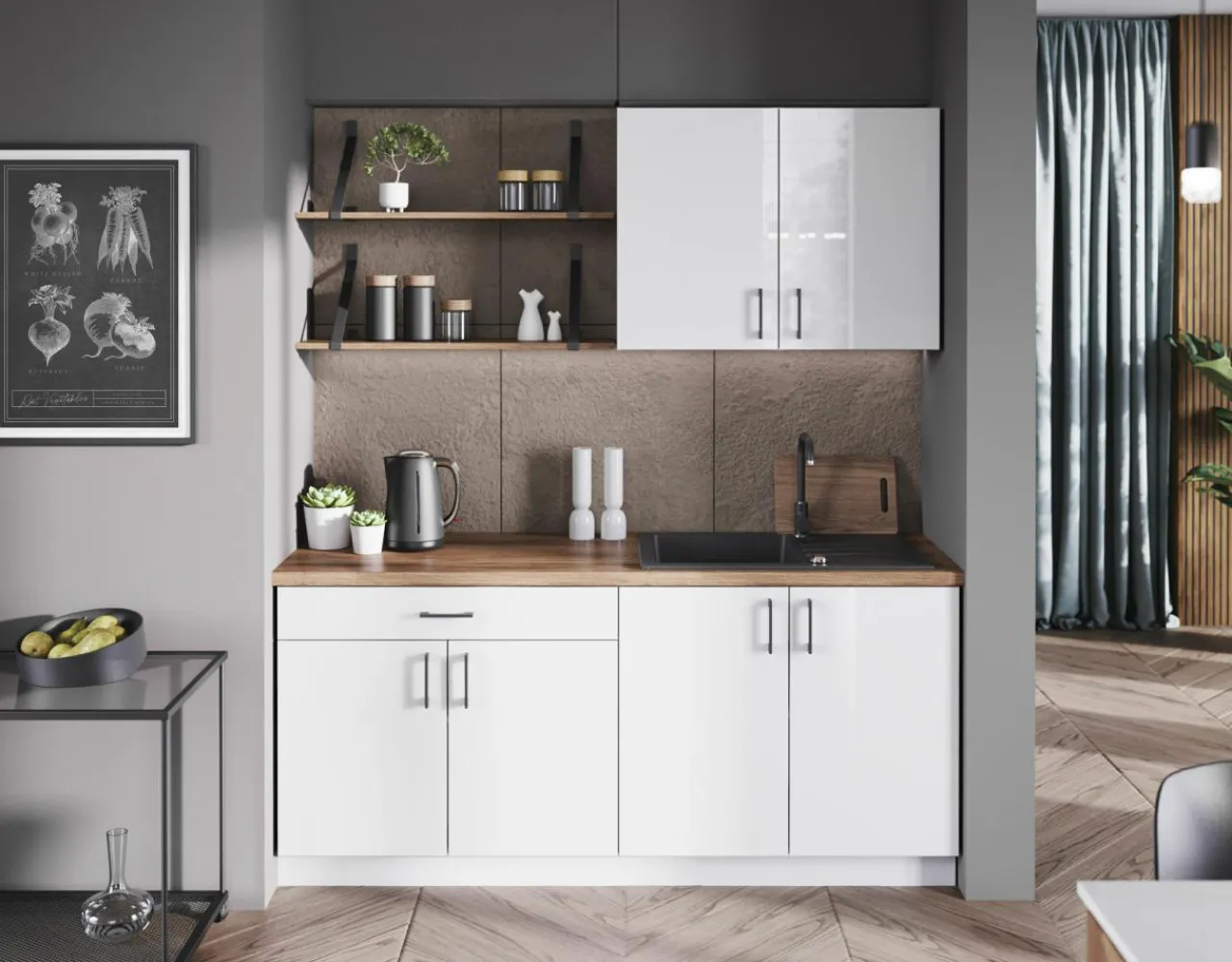 - Meble wyposażone zostały w zawiasy, uchwyty i szuflady z prowadnicami. Są funkcjonalne i proste w montażu.
