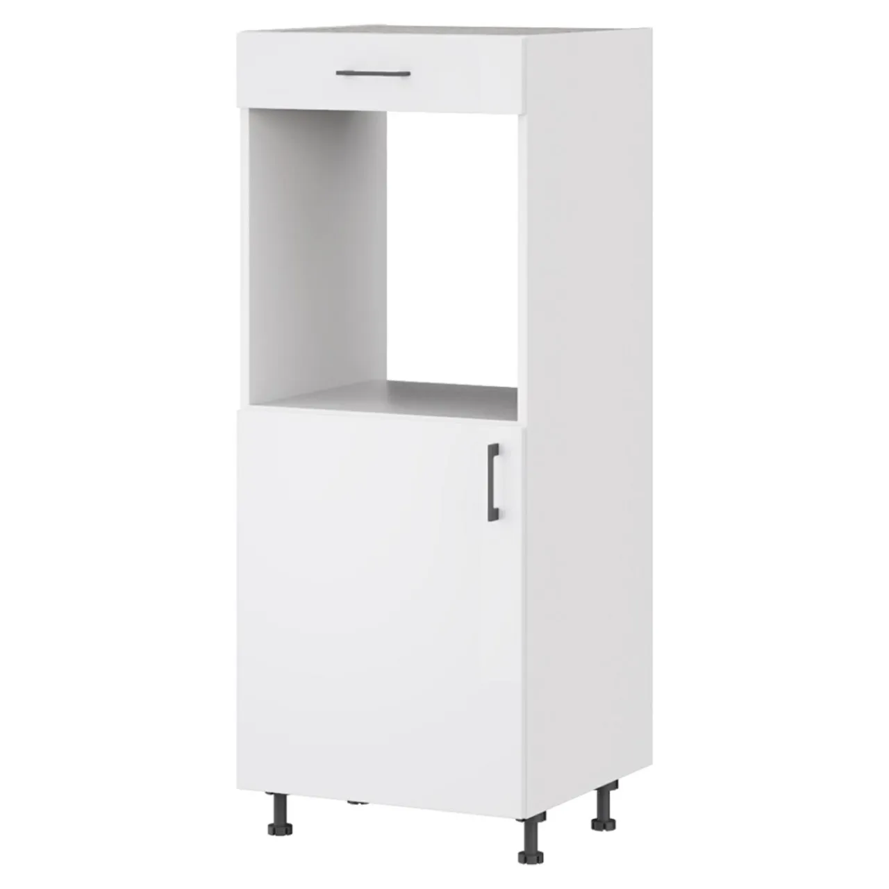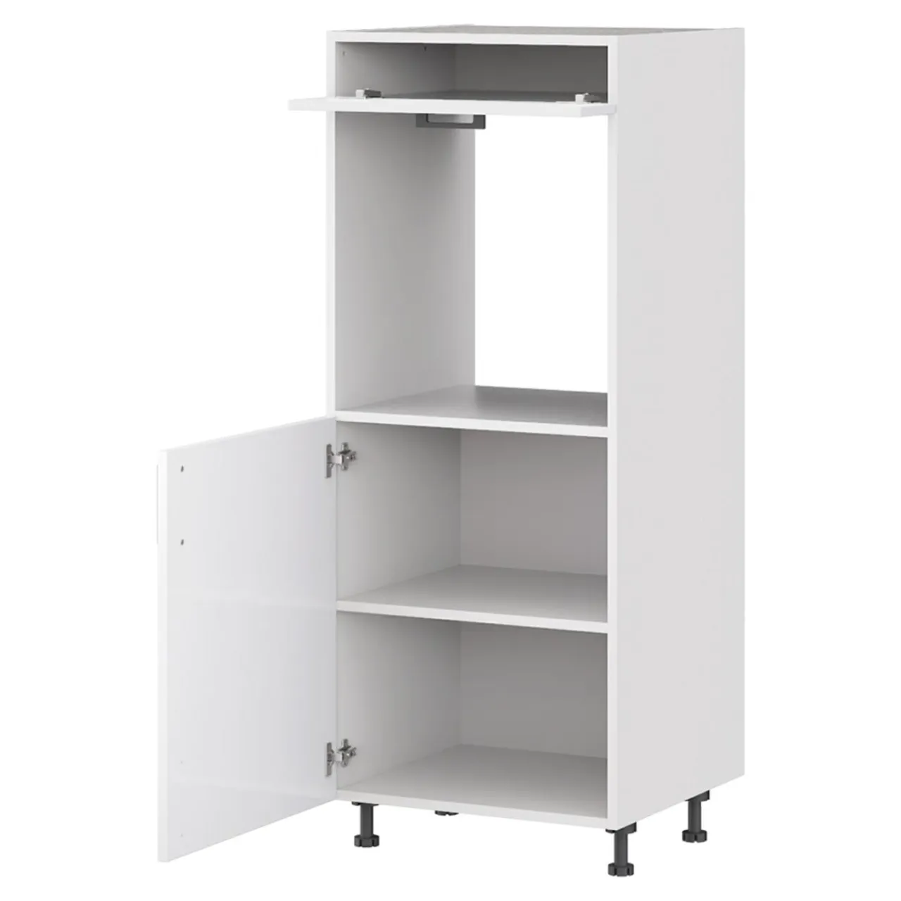 W jego dolnej części znajduje się przestrzeń przedzielona półkami, natomiast środkowa jest przeznaczona do montażu piekarnika.
