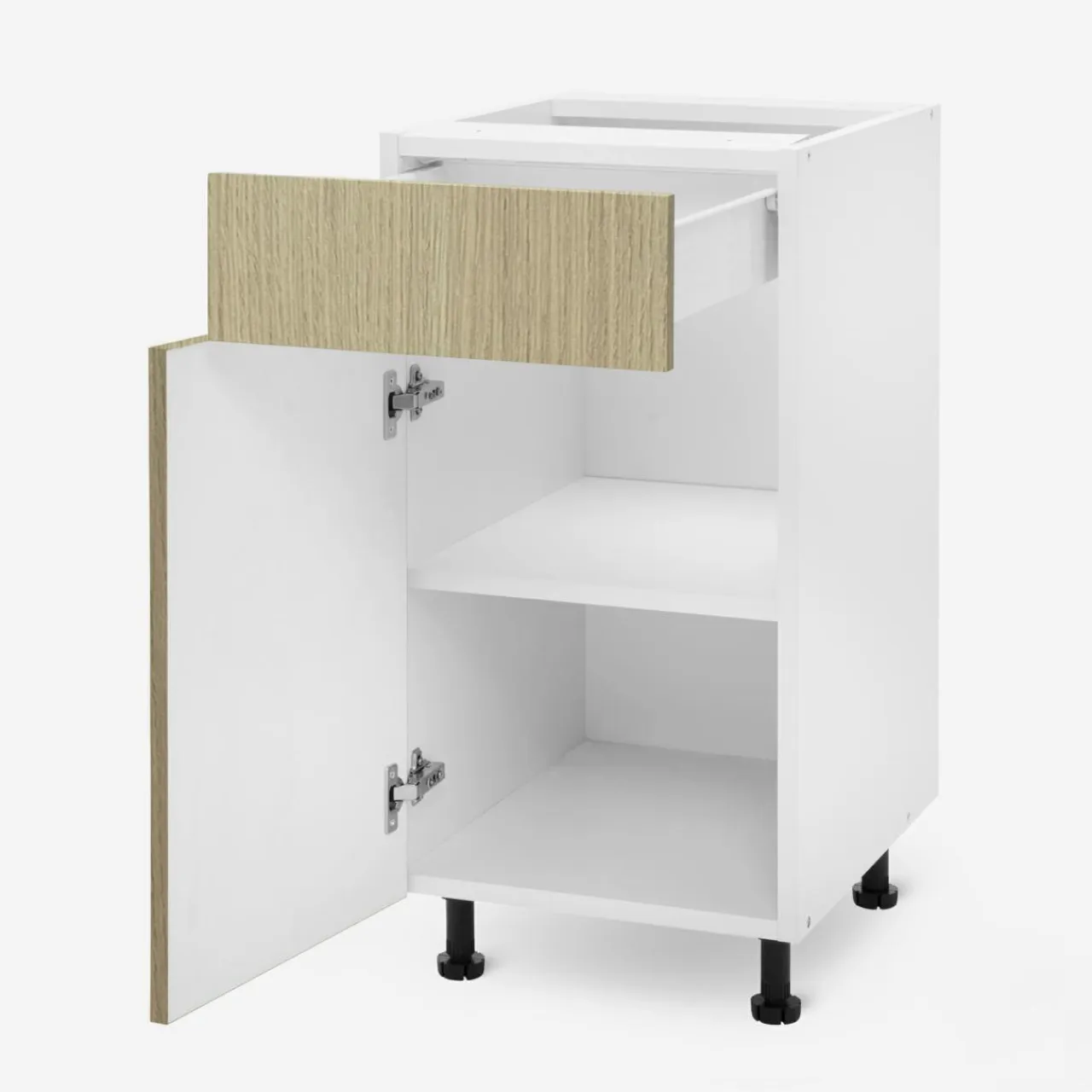 - Szafka podzielona jest na szufladę i szafkę z półką. Pozwala na oddzielenie drobnych sztućców i akcesoriów od garnków.