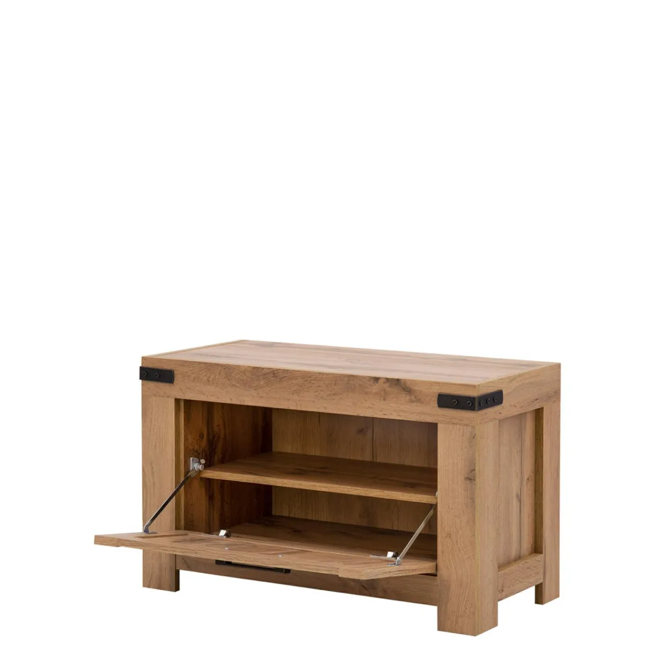Kolor laminatu przypomina wygląd surowego drewna. Pod szafką na buty znajduje się przestrzeń, ułatwiająca pracę odkurzaczem.
