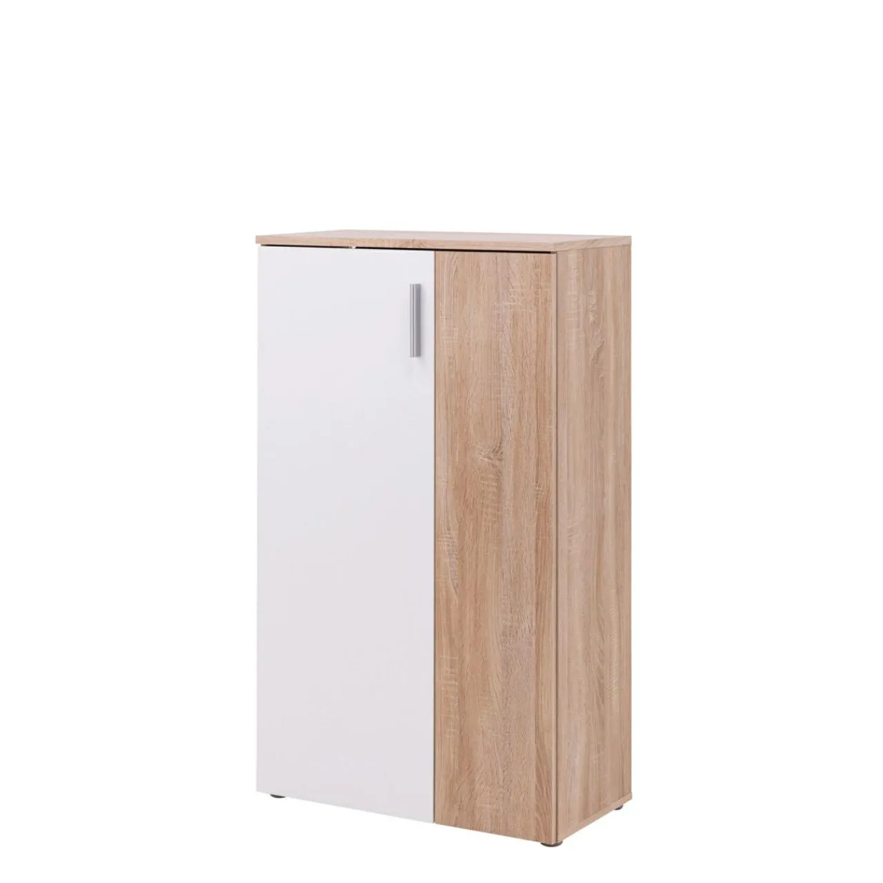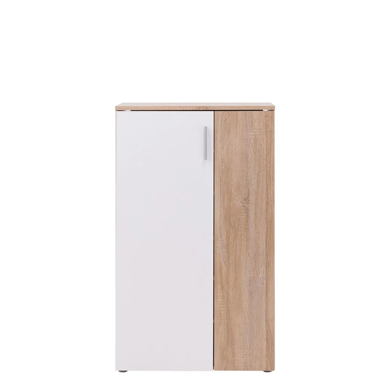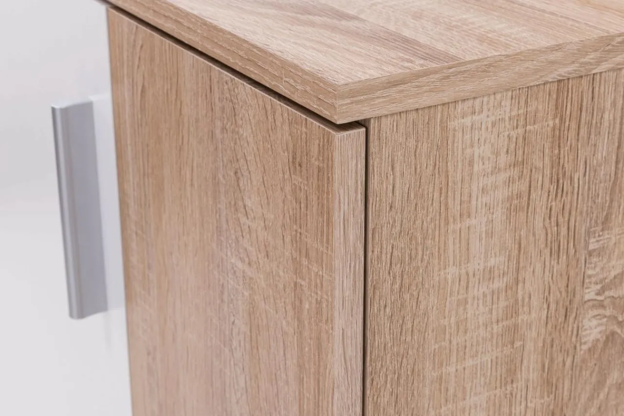 Szafka ma wystarczającą pojemność dla całej rodziny. Kolorystyka szafki to dąb sonoma i biel, którą z łatwością dopasujemy ją do pozostałych mebli w mieszkaniu.