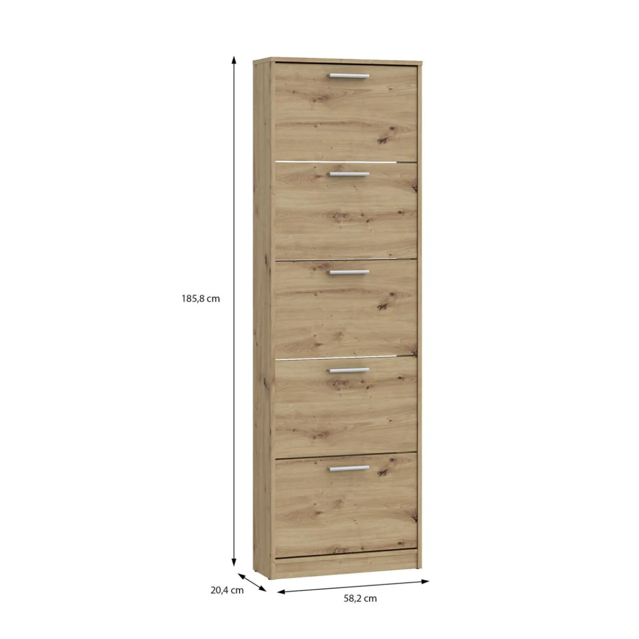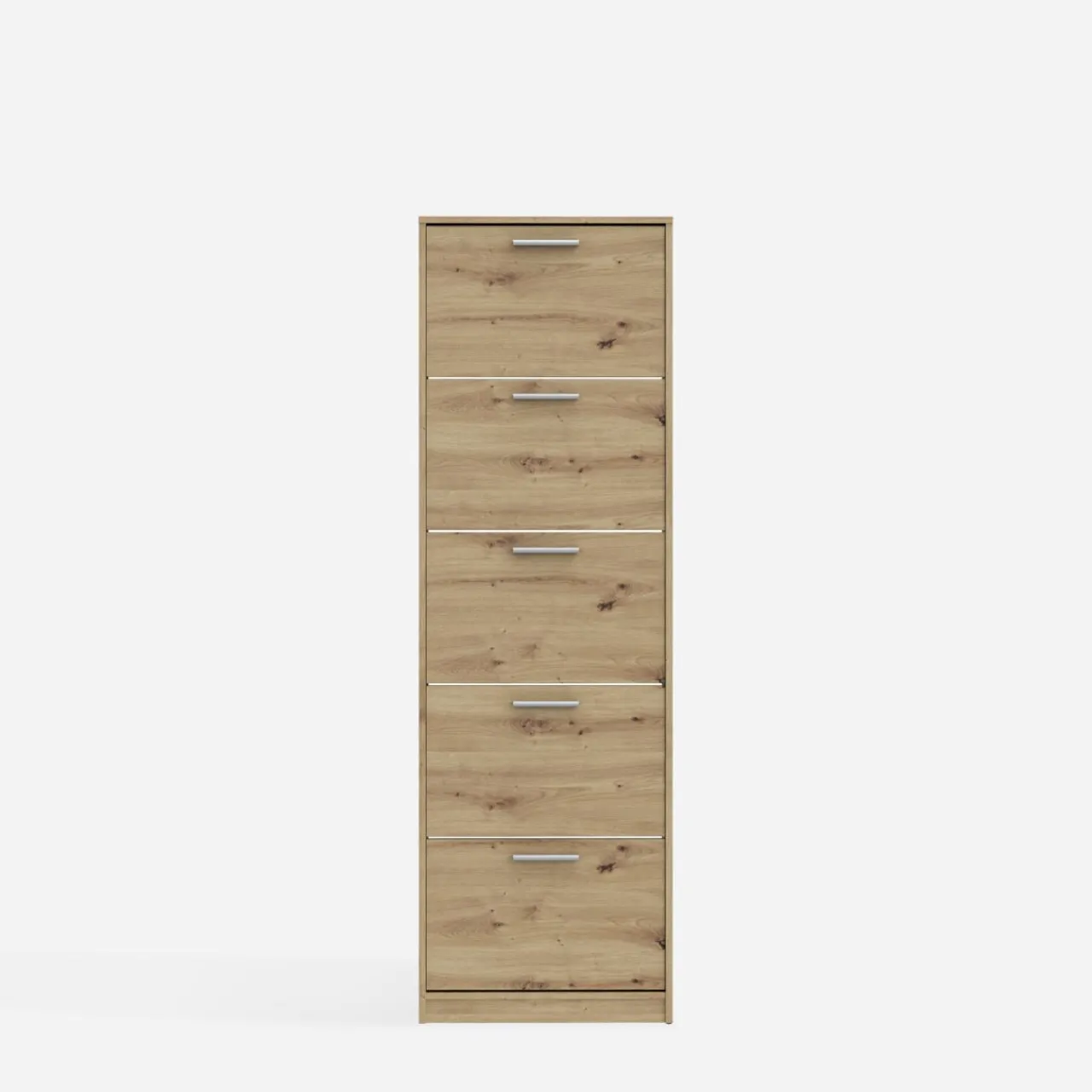 Szafka NOCII to wysoka, smukła konstrukcja idealna do przedpokoju, która pozwala przechowywać większą ilość obuwia dzięki pięciu uchylnym szufladom.