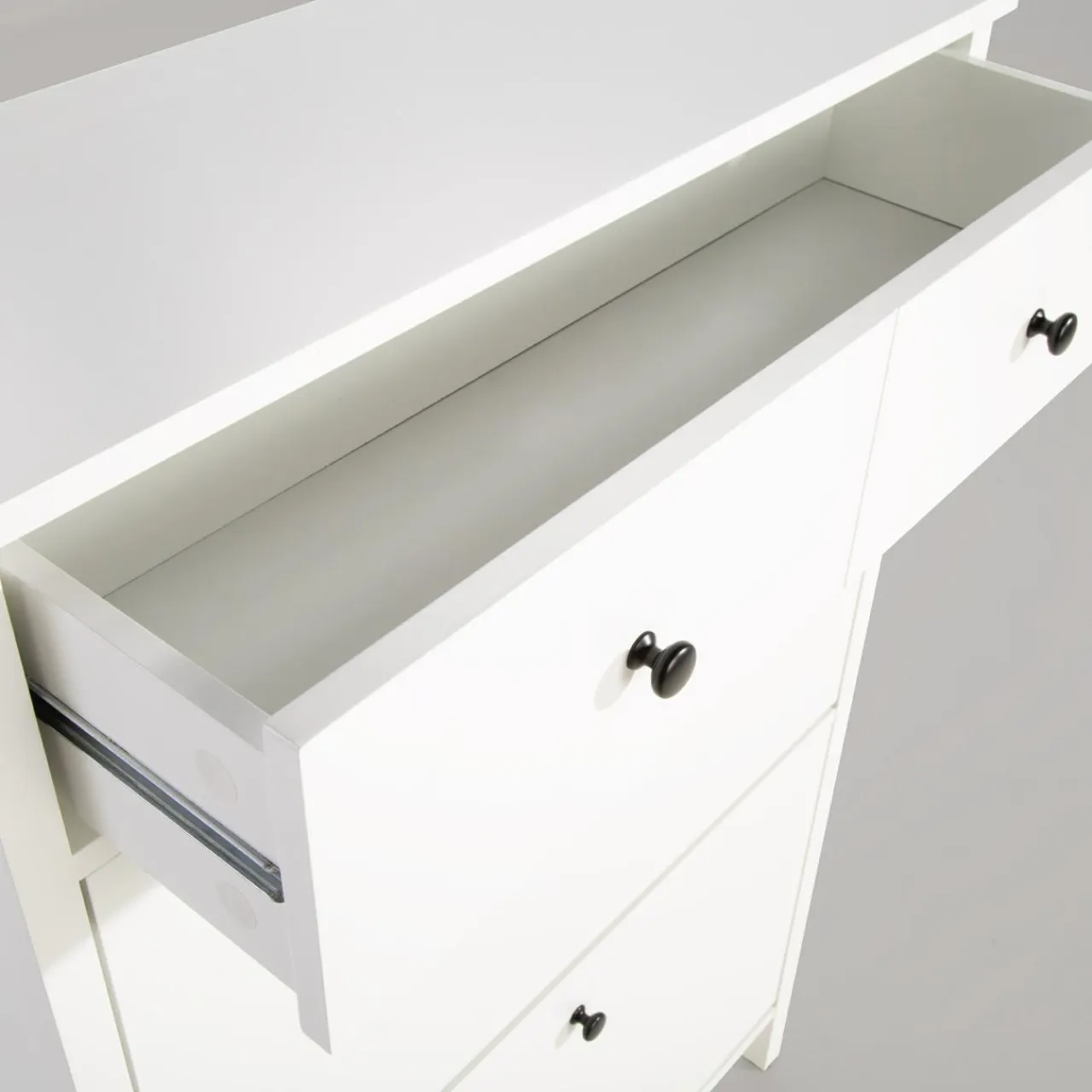 Bryły w białym kolorze rozjaśnią wnętrze, a mnóstwo szuflad i wnęk zapewni Ci odpowiednią ilość miejsca na buty i ubrania.