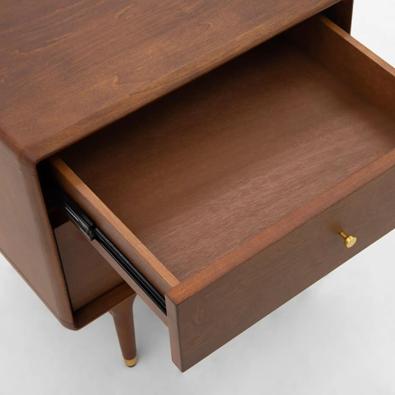 Minimalistyczne akcenty z mosiądzu w postaci uchwytów i końcówek nóżek podkreślają jakość wykonanych mebli.