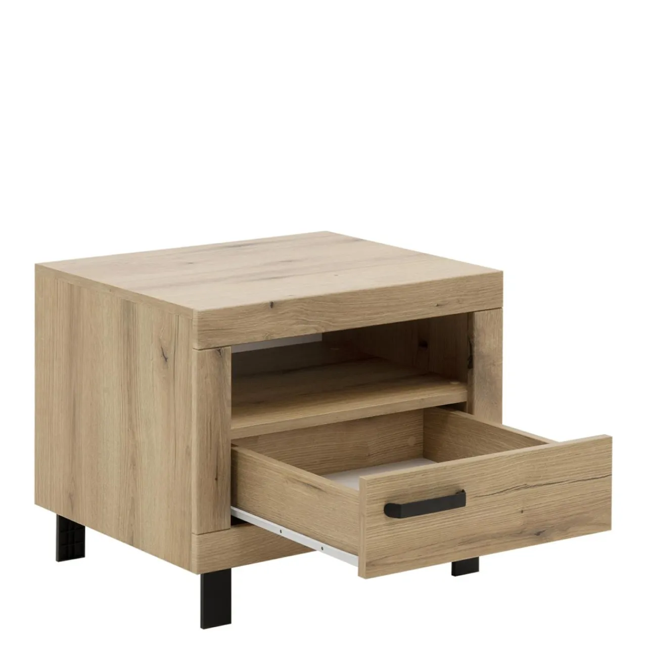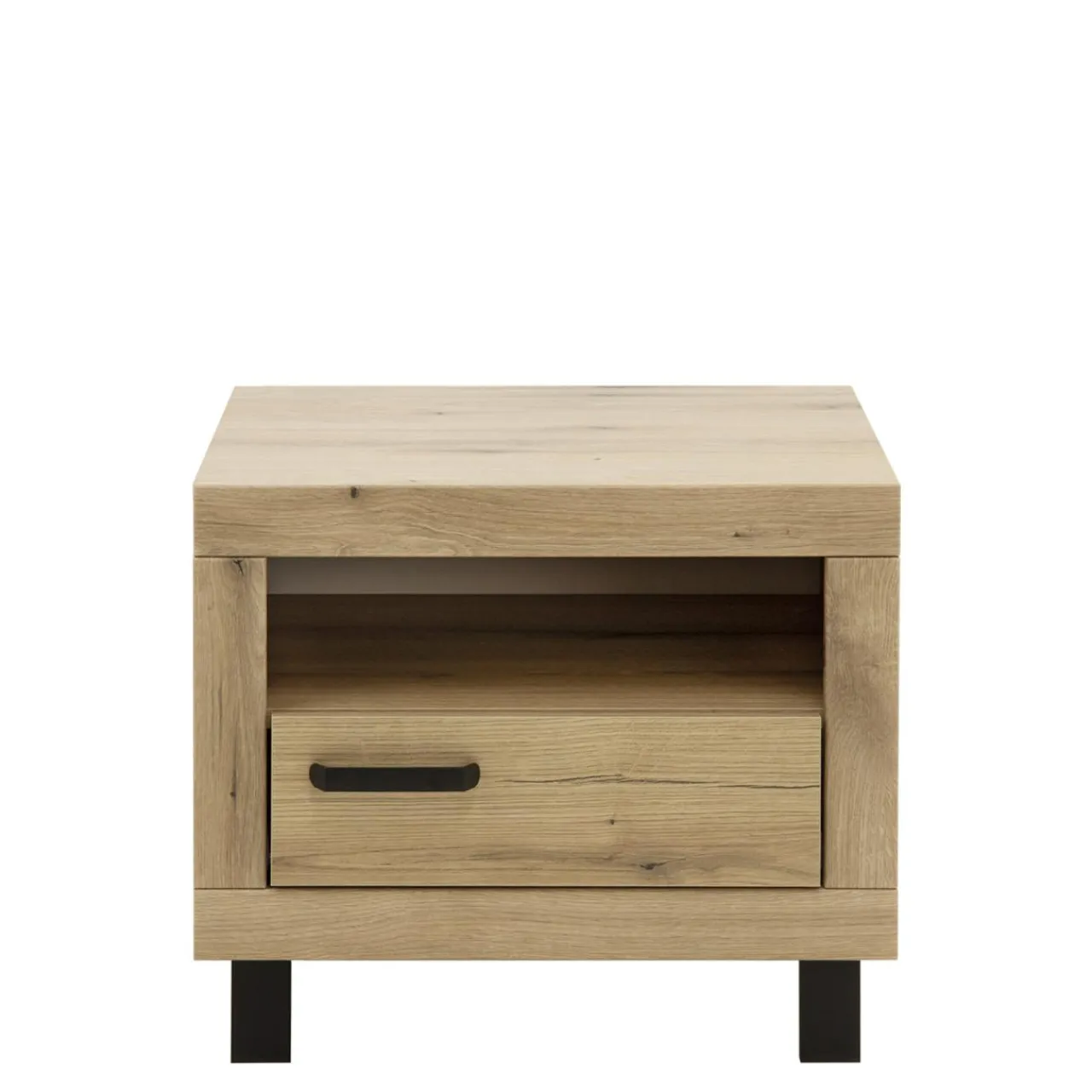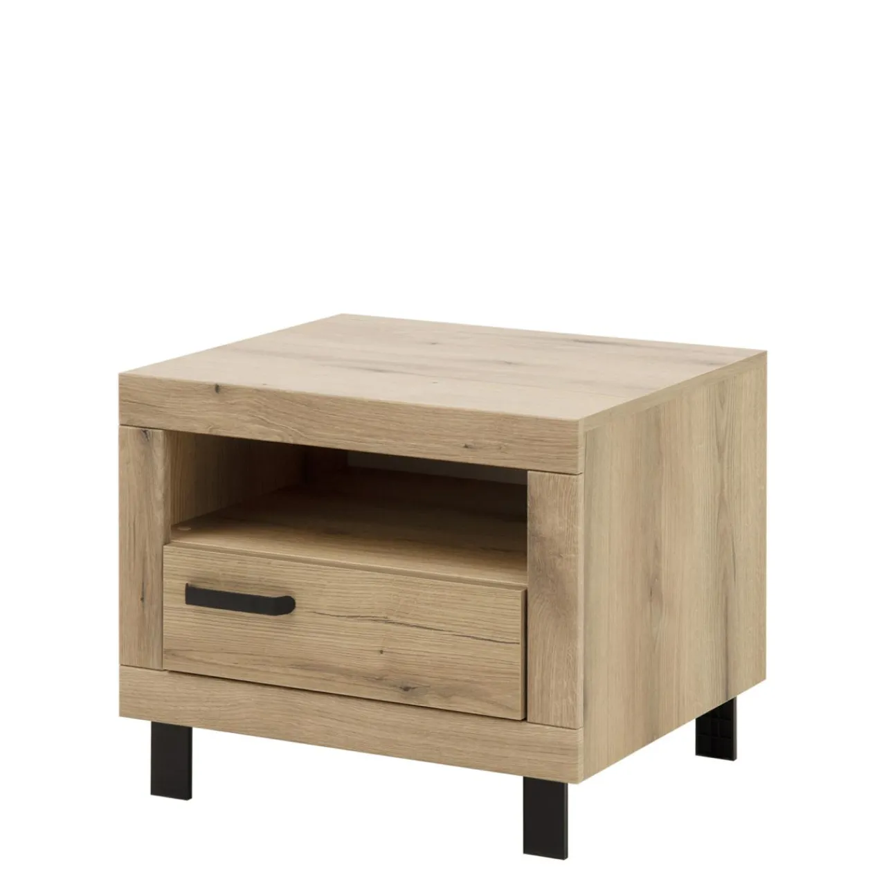 - Czarne nóżki z tworzywa oraz matowy uchwyt nada szafce nocnej odrobinę charakteru.