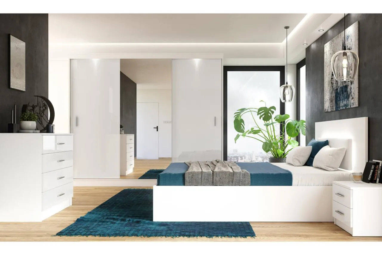 Biała szafka nocna świetnie wpasuje się w aranżację nowoczesnej sypialni.
