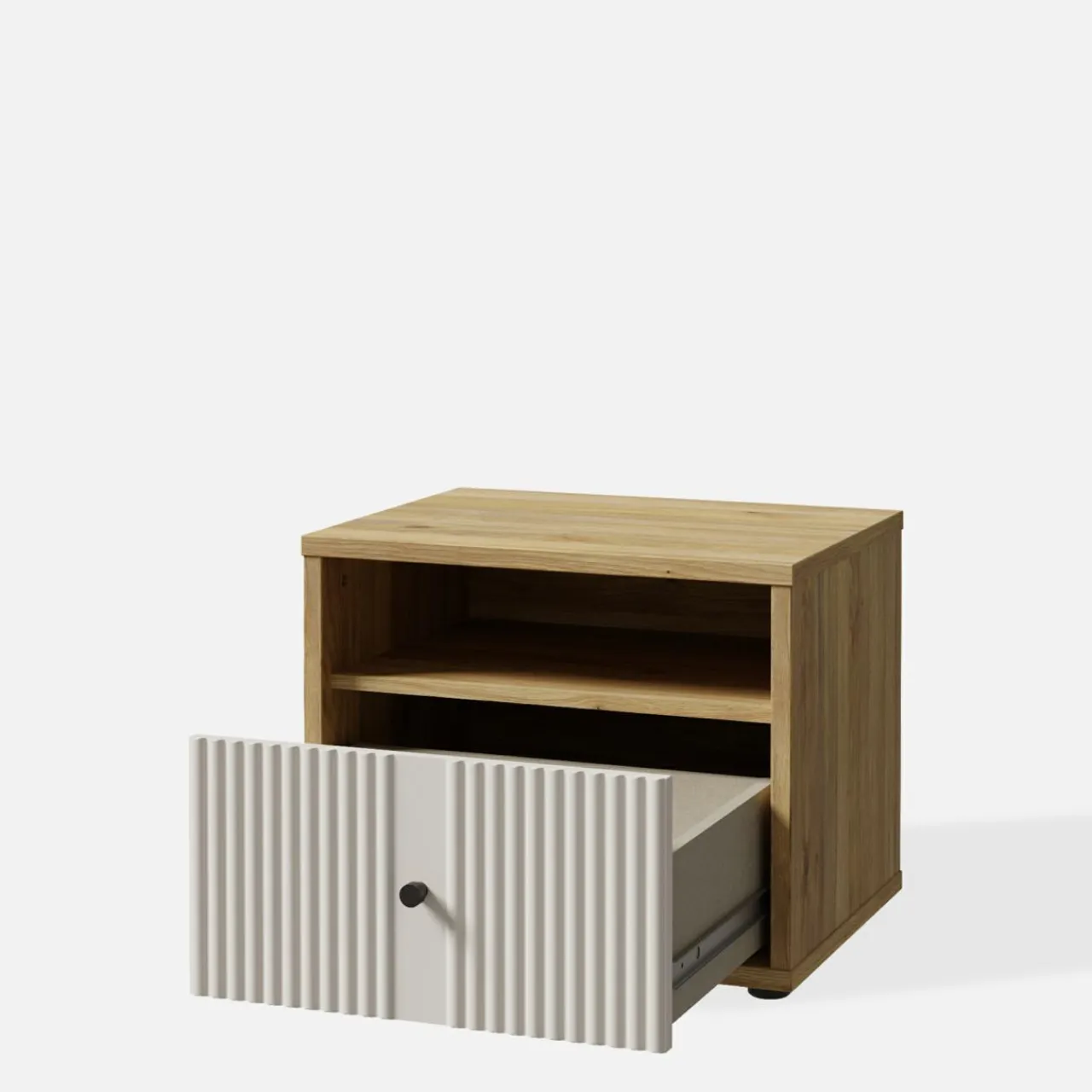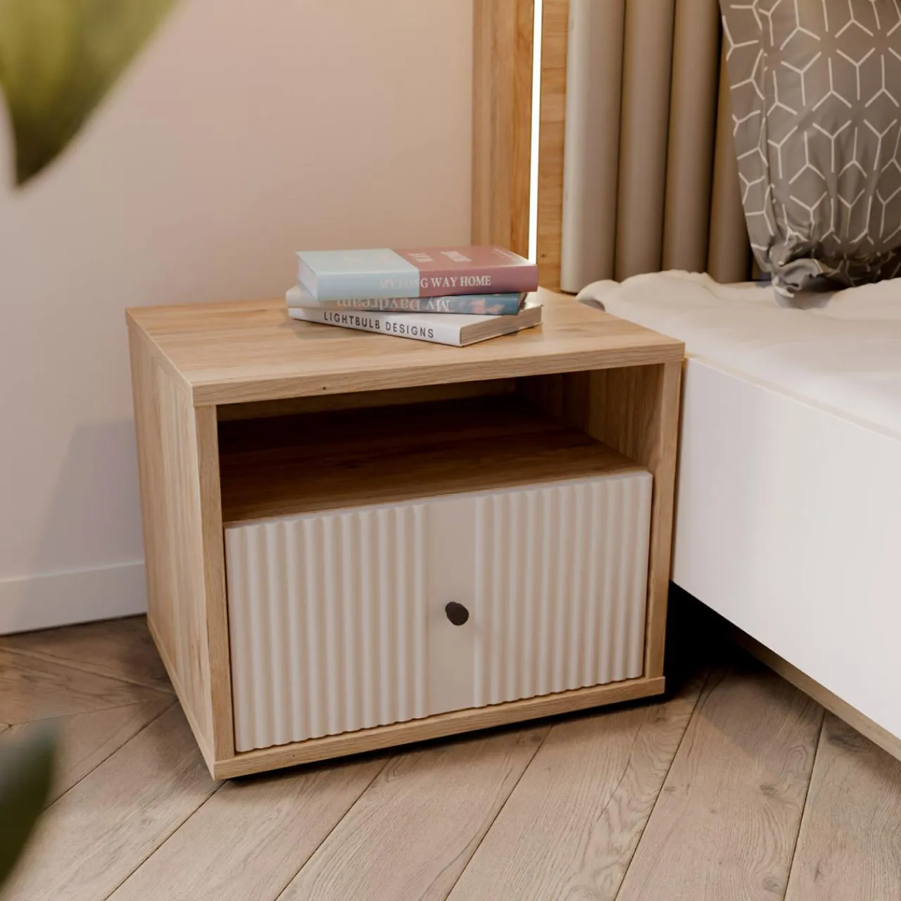 Szafka nocna RANKIN z szufladą pomieści wszystko, co chcesz mieć w pobliżu łóżka. Opaska na oczy, lekarstwa i inne rzeczy będą ukryte przed kurzem, a Ty zwiększysz swoją higienę snu.