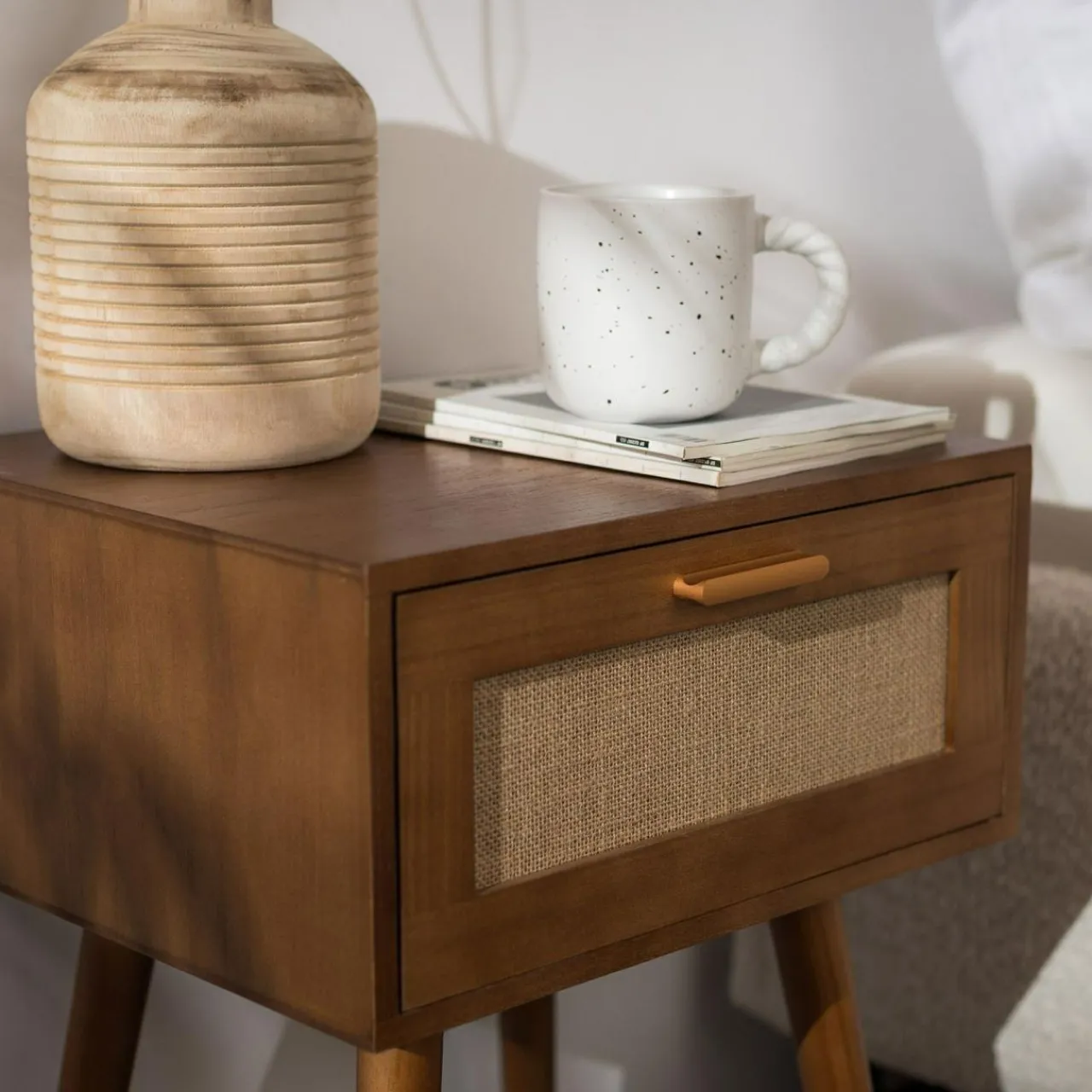 Szafka nocna CALAMO wyróżnia się bursztynowym odcieniem drewna i plecionym zdobieniem na froncie. Akcentu w stylu boho świetnie łączy się ze złotym cynkowym uchwytem i skośnymi nogami z litej sosny.