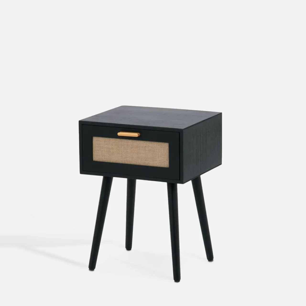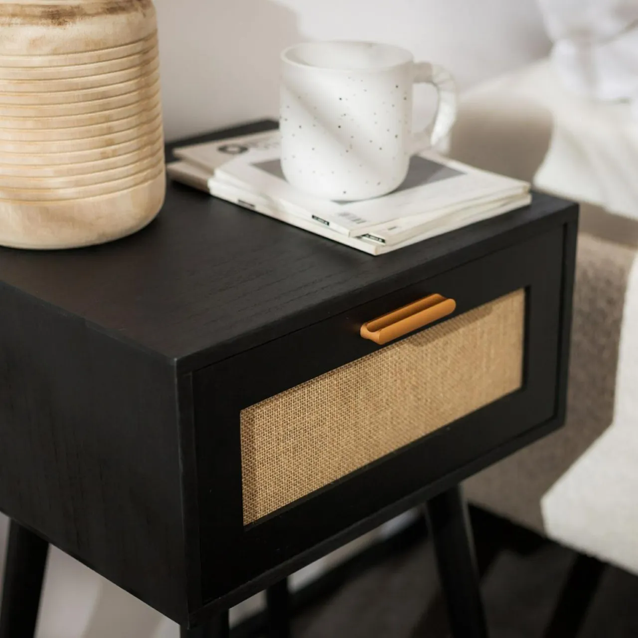 Szafka nocna CALAMO wyróżnia się czarnym odcieniem drewna i plecionym zdobieniem na froncie. Akcentu w stylu boho świetnie łączy się ze złotym cynkowym uchwytem i skośnymi nogami z litej sosny.