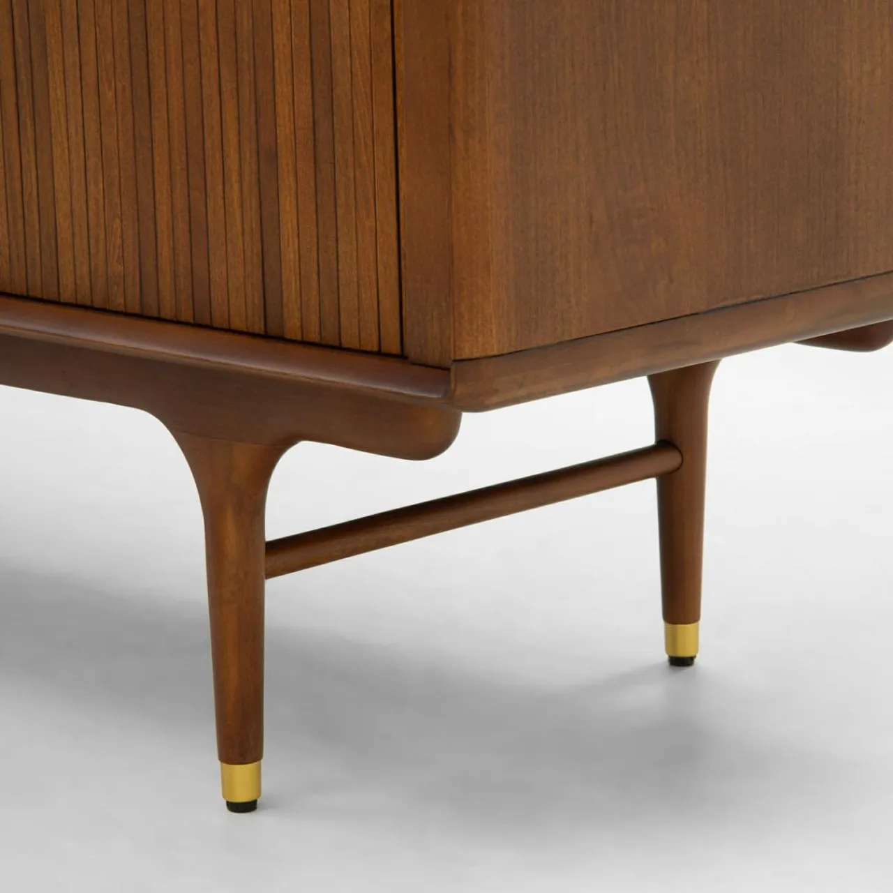 Minimalistyczne akcenty z mosiądzu w postaci uchwytów i końcówek nóżek podkreślają jakość wykonanych mebli.