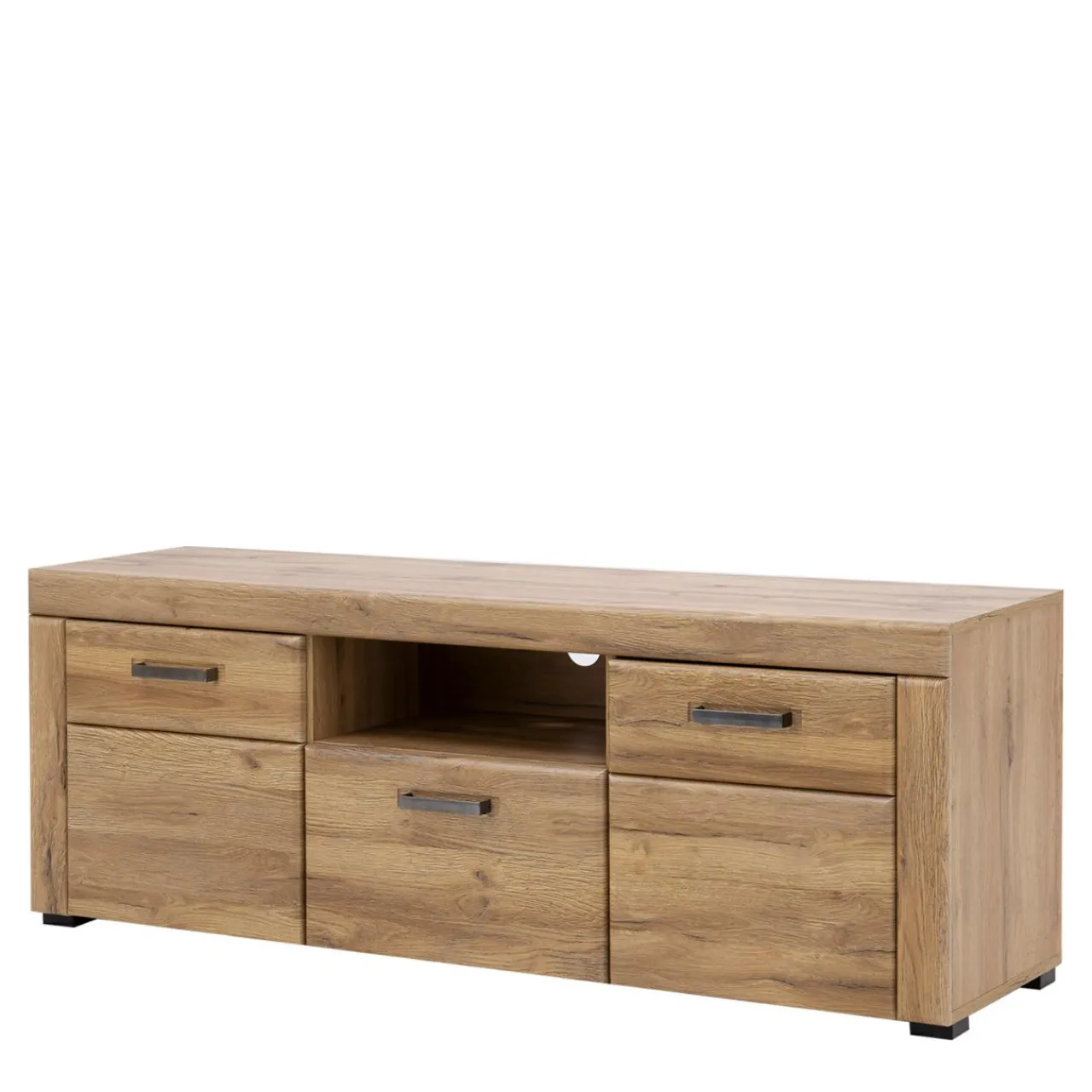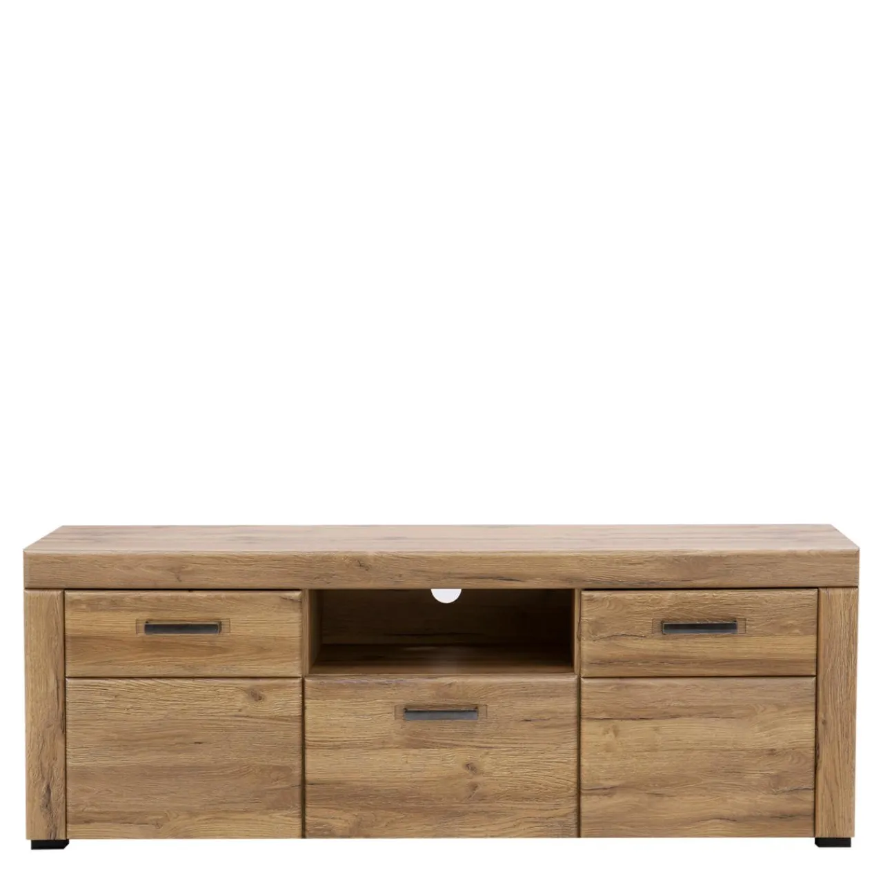 - Umieszczona pośrodku pod blatem otwarta wnęka to idealne miejsce na dekoder czy konsolę. Umieszczony z tyłu otwór pozwala ukryć nieestetycznie wyglądające kable.